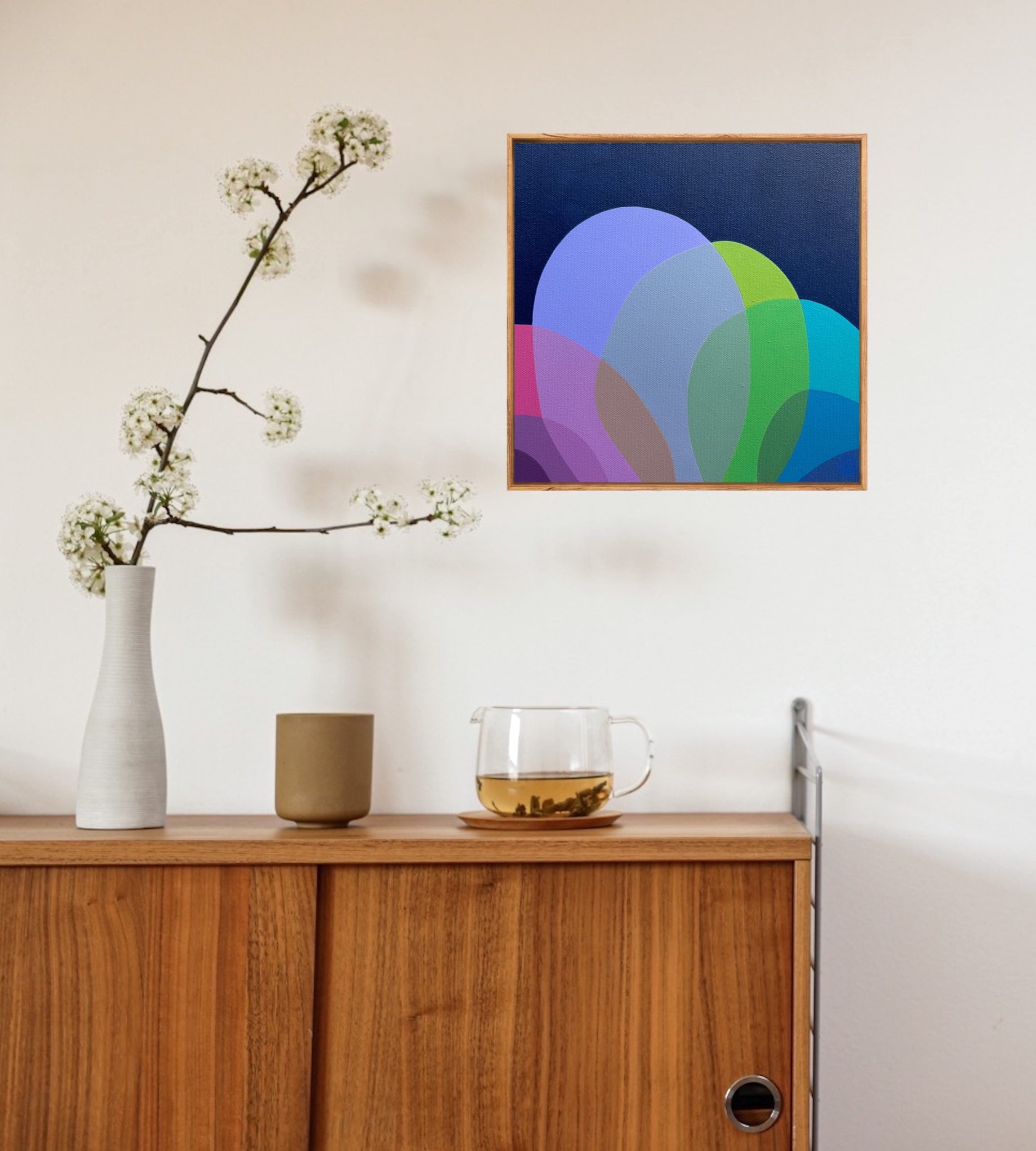 In this original painting, Charlotte is inspired by floral forms and embraces her distinctive, hard-edged abstract style, continuing her fascination with overlapping shapes and juxtaposition of bold colours to achieve a sense of luminosity and equilibrium. Vibrant, uplifting, harmonious and colourful.