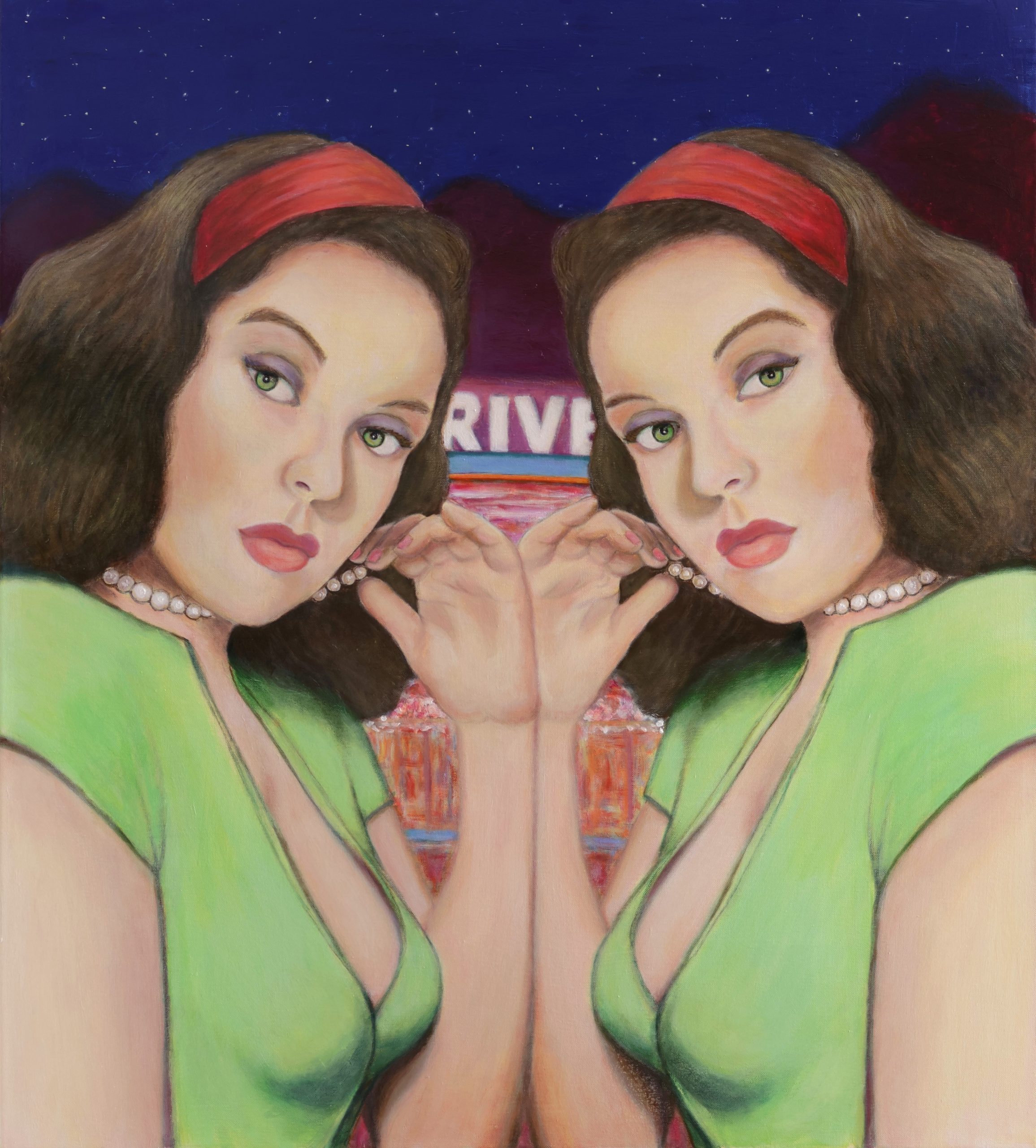 Midnight Drive is an original painting of a doppelganger image, reminiscent of retro-pop art. The beautiful twins’ presence is both enticing and mysterious.