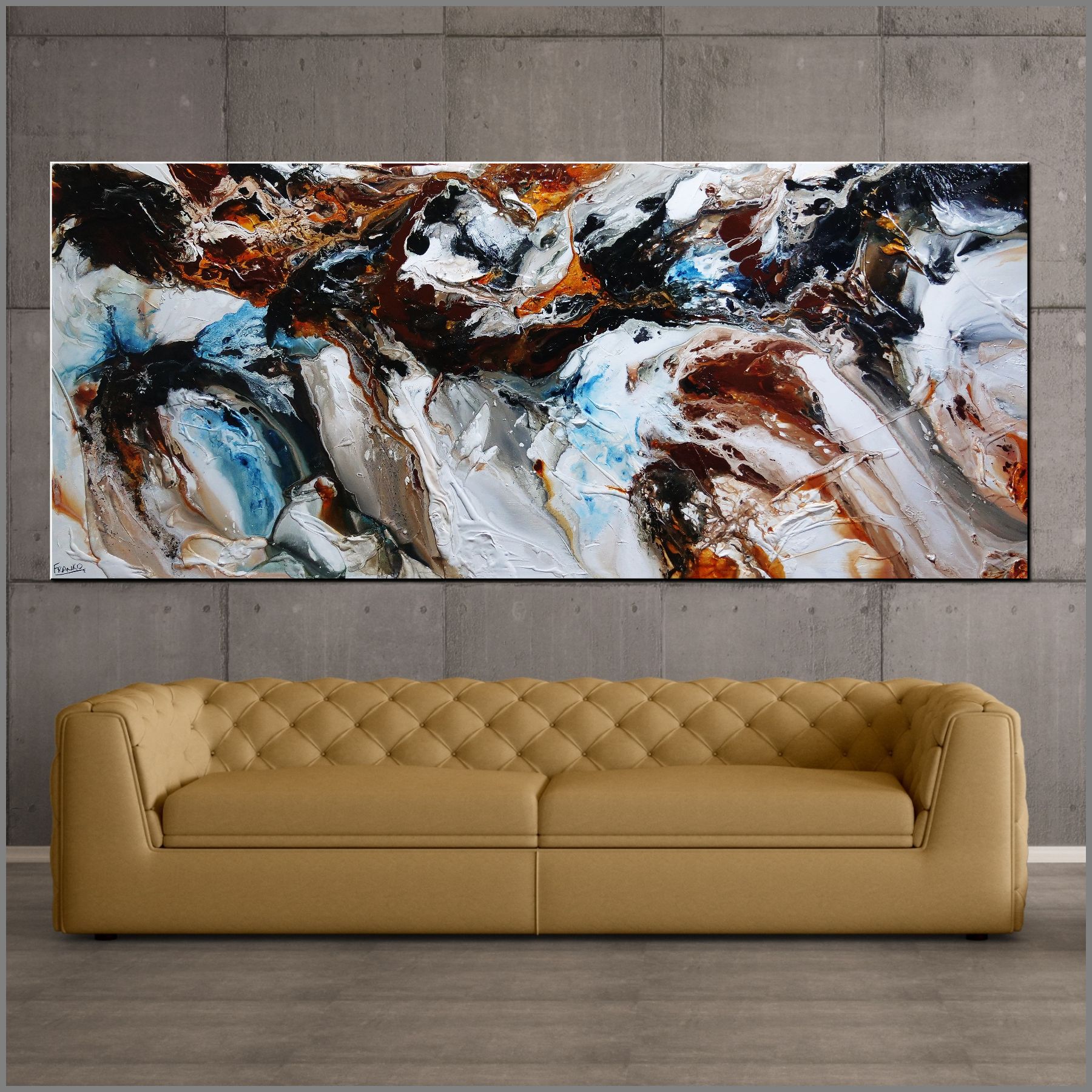 Brown, blue, orange, grey, oxide, black and white acrylics, oils and inks! All of my abstracts come off a deep base and always include textured layers from the base to the top. This painting, like all of my pieces, is a mixture of acrylics, inks and milked sugars with intermittent use of oil based layers.