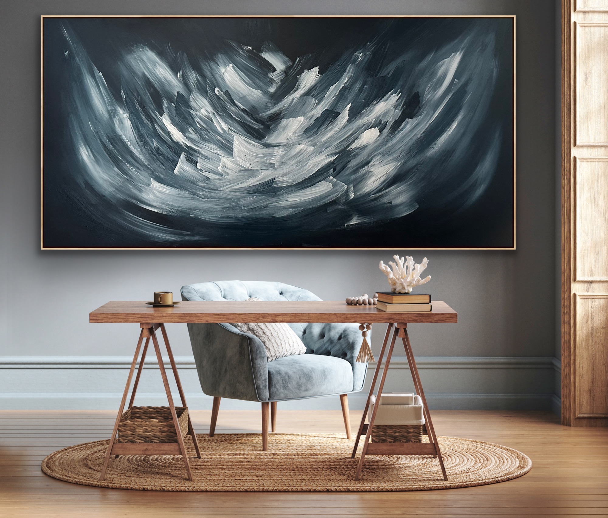 This extra large monochrome painting is a subtle statement in any space with purposely placed brushstrokes that blend into the background.