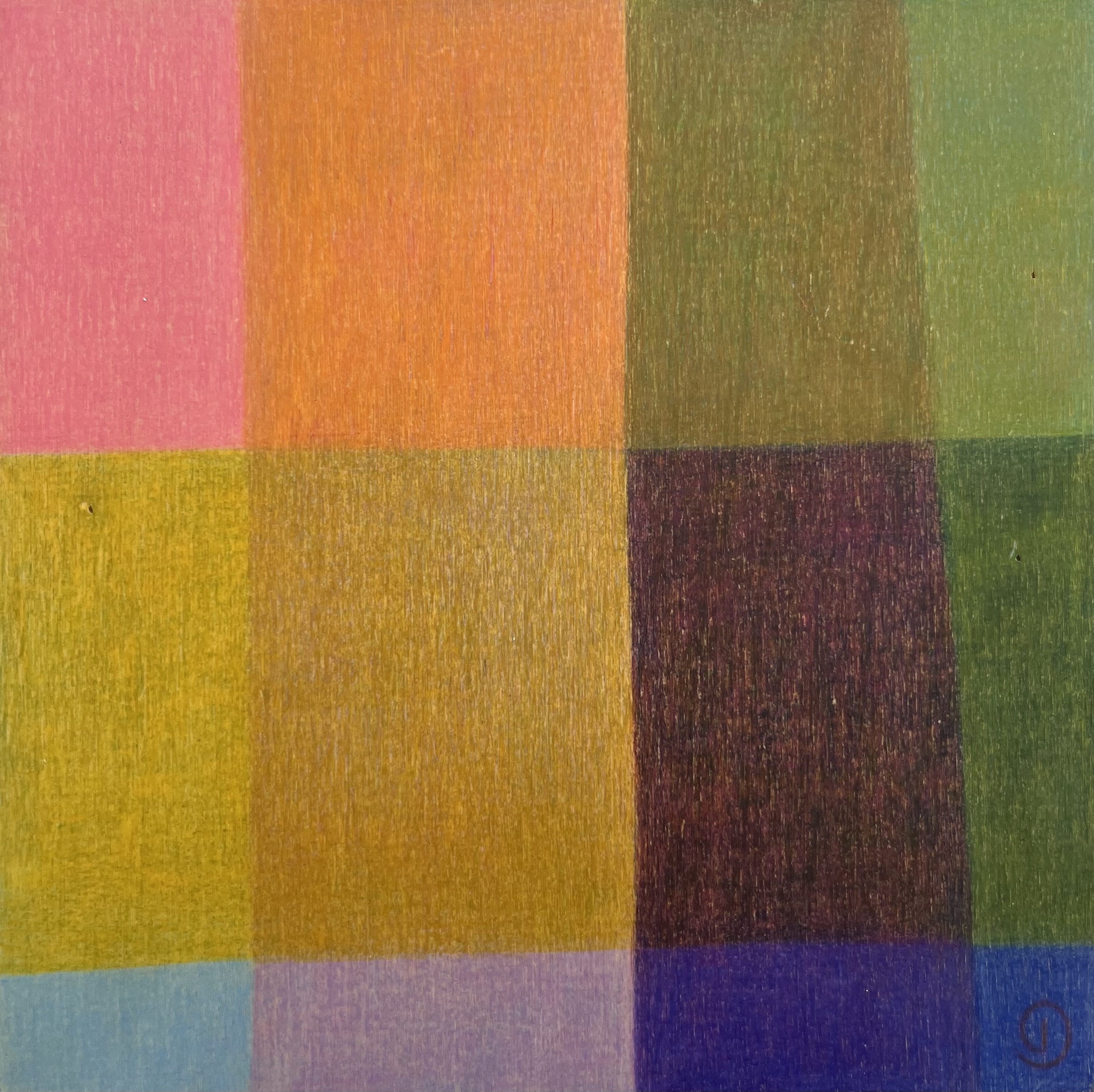 In the Colourfields series, Charlotte is inspired by colour theory and stylised forms from nature (such as aerial views of rural paddocks). She embraces a distinctive, abstract style, overlapping shapes and layering vibrant colours to achieve a sense of luminosity and equilibrium. Using archival colour pencil on wood board allows Charlotte to incorporate the natural grain and imperfections of the surface into the artwork creating textural elements that emerge on closer inspection and give added complexity and a sense of depth to the piece.