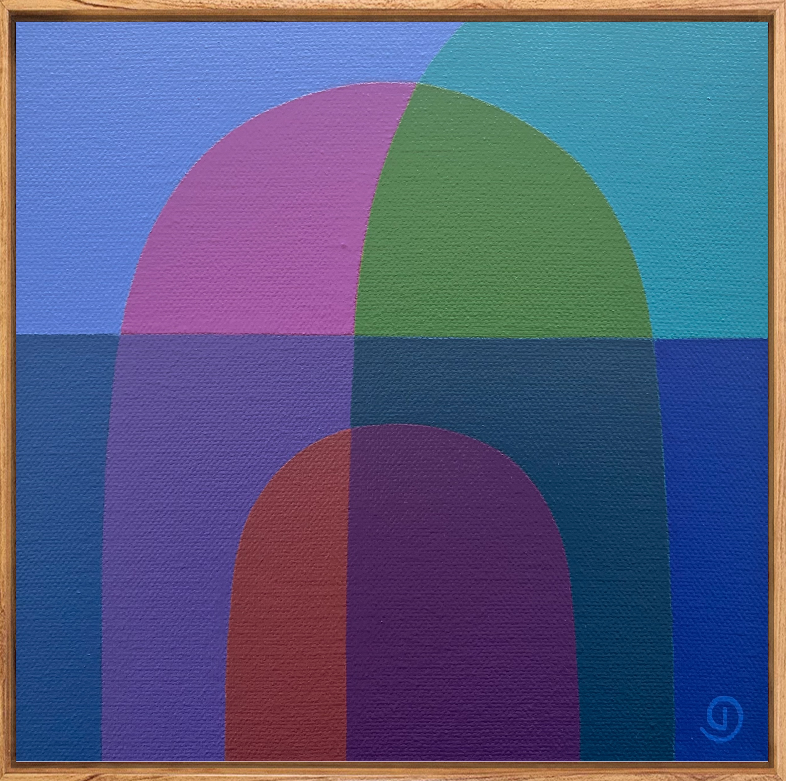 This original abstract painting is part of a series that is inspired by seaside getaways and the calming influence of the ocean and coastal landscapes. Created in Charlotte’s distinctive hard-edge style, this colourful painting draws on physical elements of a beach landscape (the sea, cliffs, horizon etc) to form an uplifting abstract composition. This work expresses Charlotte’s ongoing fascination with layering and juxtaposing vivid colour to play with opposing ideas of transparency and solidity, simplicity and complexity.