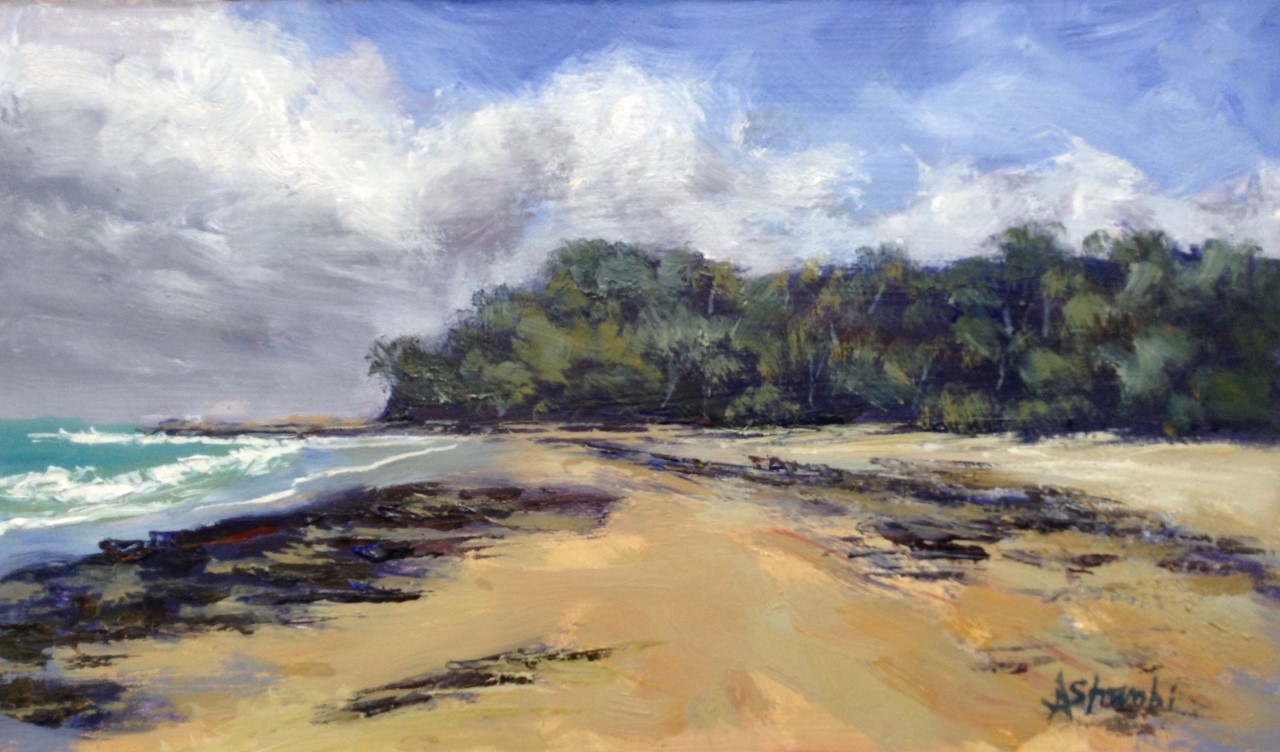This original oil painting is inspired by my memories of beach holidays at the lovely seaside location of Minnie Water in northern NSW. This painting focuses on the headland near the lagoon where you can walk around the rocks to the next beach, or wander along the sand where the seaweed dries in the sun.