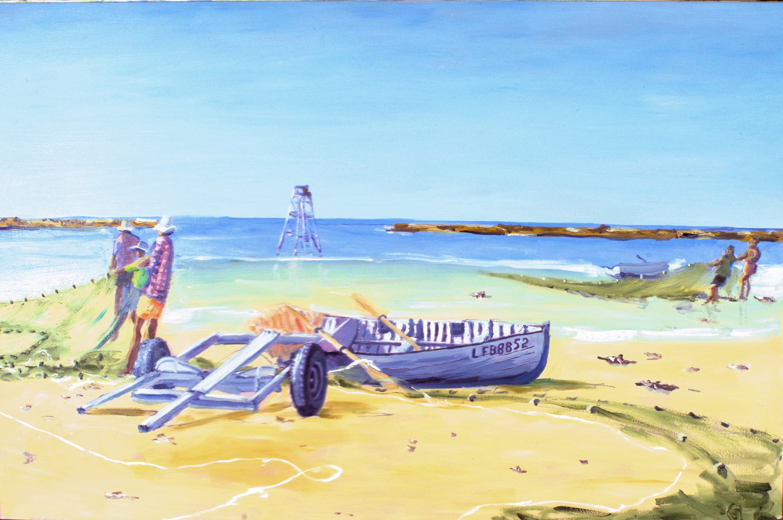 Original Oil painting of local professional Fishermen at Minnie Waters hauling in the Net full of school sea mullet.