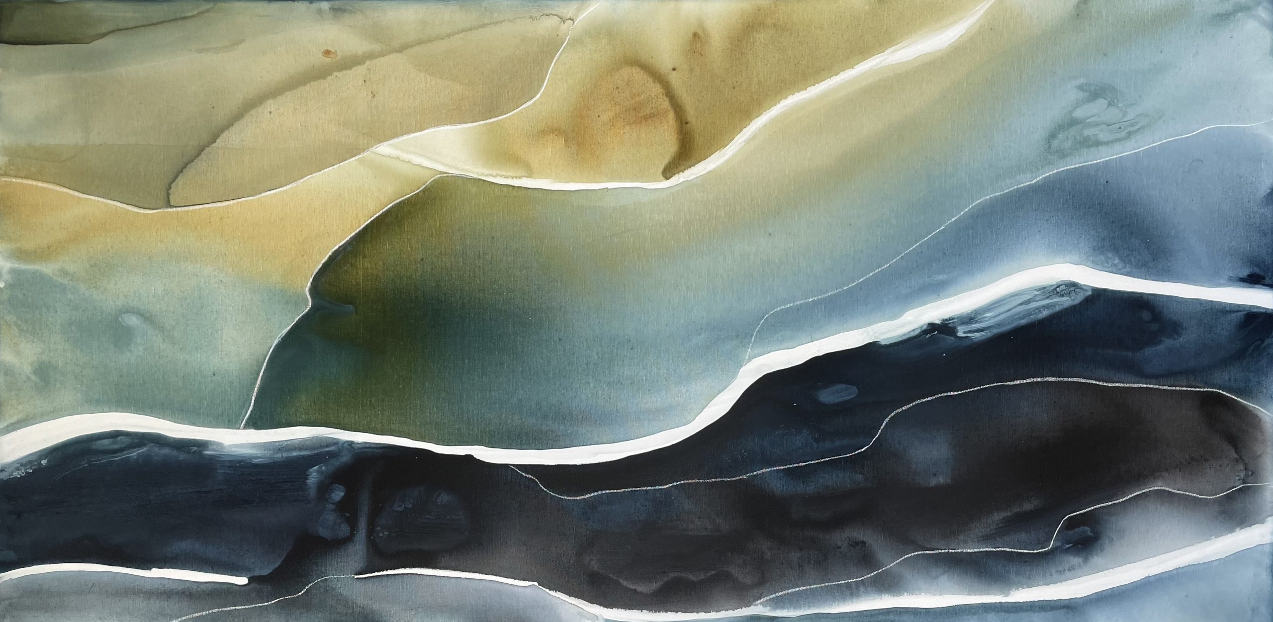 Minoa 2 by Dinah Wakefield is inspired by the light, the colours and the natural beauty of the Noosa region of Australia. “What I love most about Noosa is the interplay of light. From the oceans to the clouds, to the river estuaries and the hinterland, this canvas unfolds before me every day and finds expression in my paintings”.
