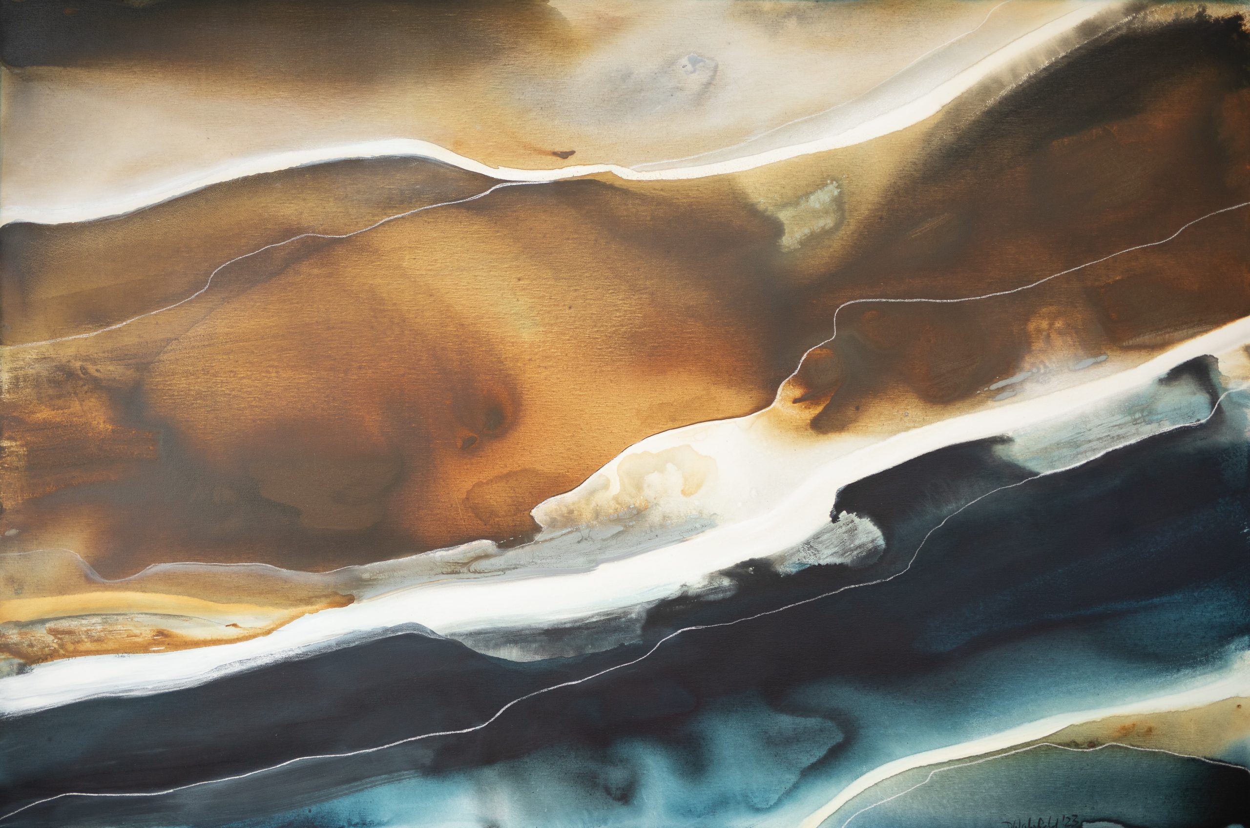 Minyirr by Dinah Wakefield is inspired by the light, the colours and the natural beauty of the Noosa region of Australia. “What I love most about Noosa is the interplay of light. From the oceans to the clouds, to the river estuaries and the hinterland, this canvas unfolds before me every day and finds expression in my paintings”.