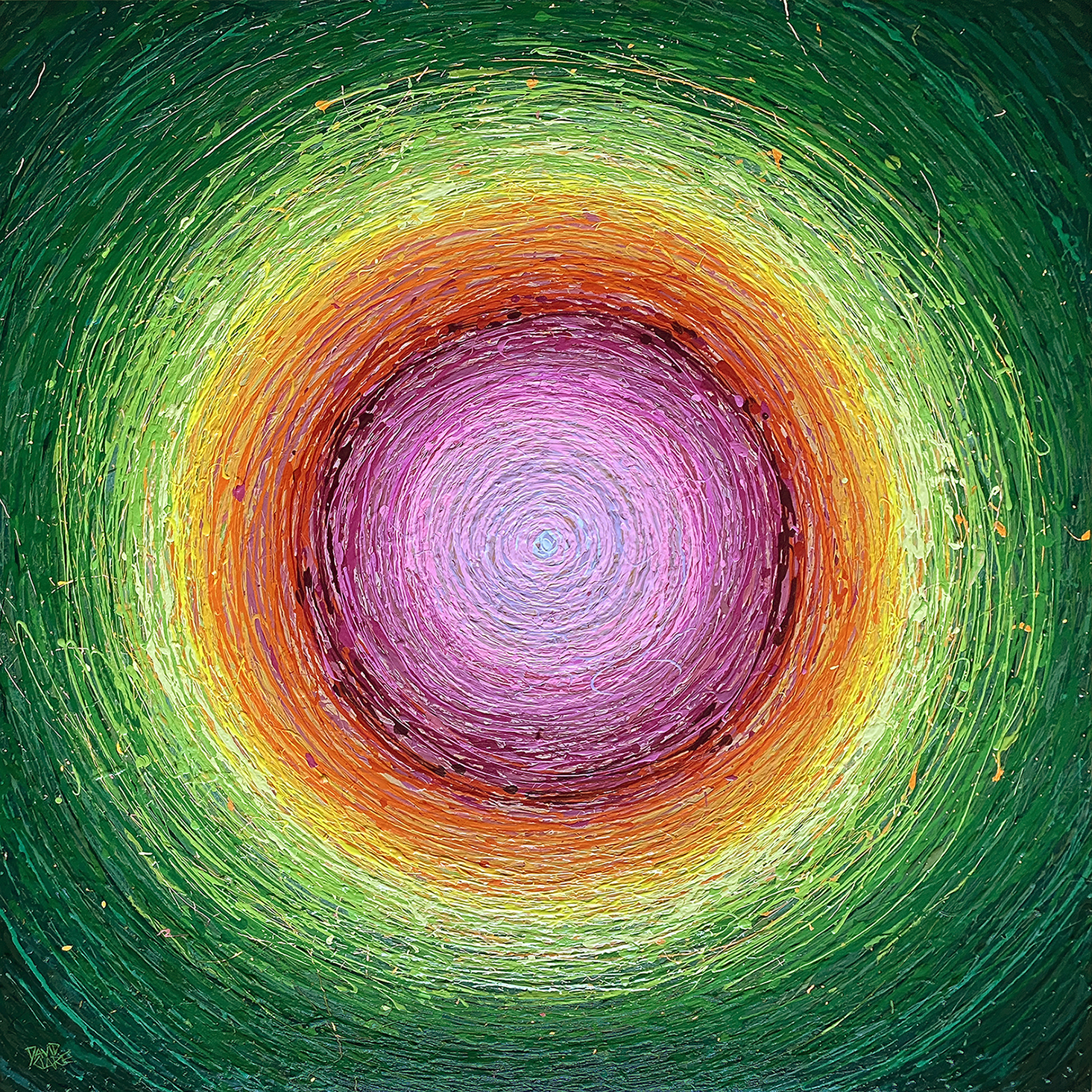 Mirage Sun in Green Orange And Pink by David Clare is a different spin (literally) on his current Mirage series of paintings. Pure colour dripped and flicked in a circular motion to create a vignetted design.