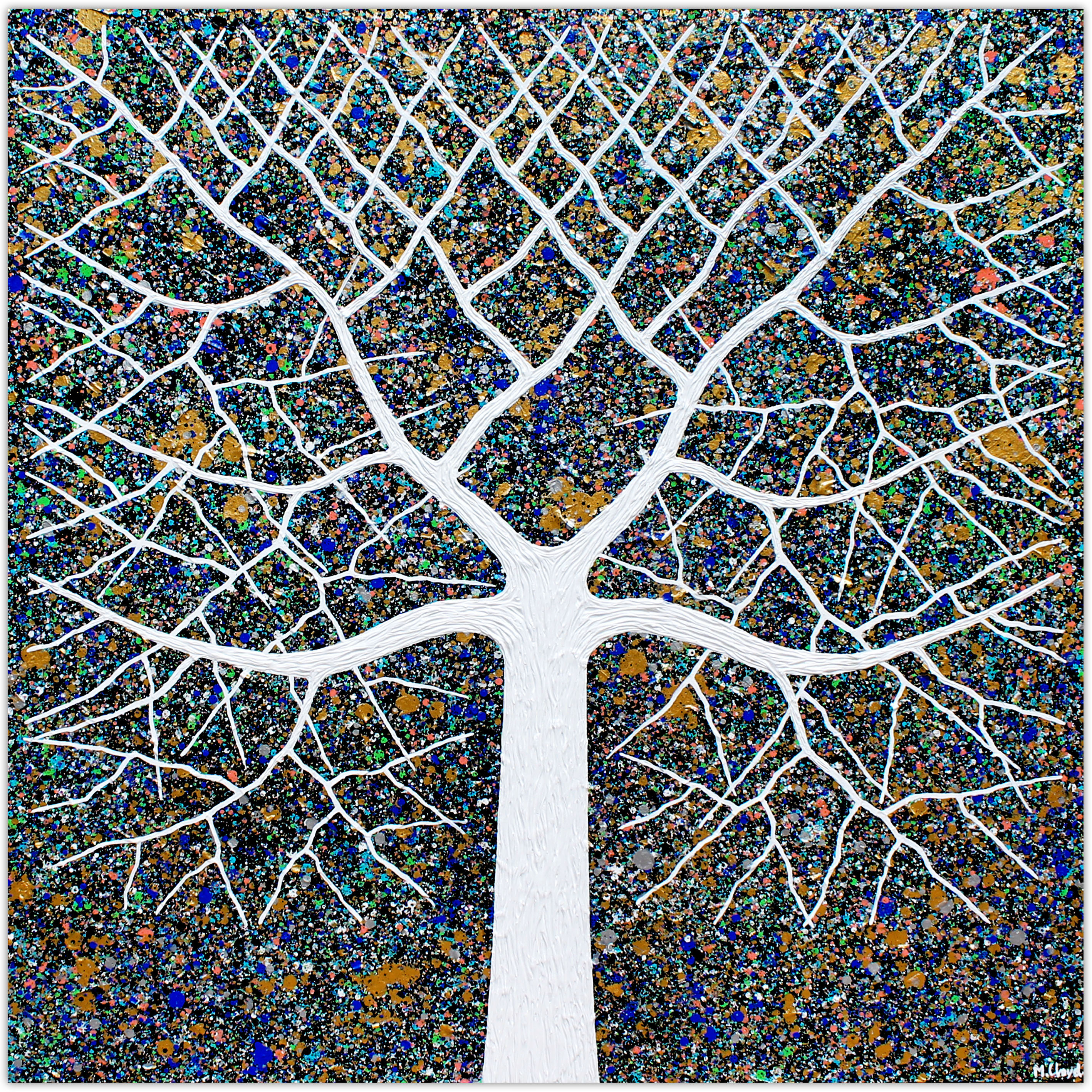 My signature style tree in starry blacks, blues with chunky golds and hints of greens, white, metallic gold and silver. A dramatic contemporary piece of traditional blacks and whites but with bright specks of colour. Heavy textures both in the background and the tree itself. A real show stopper.