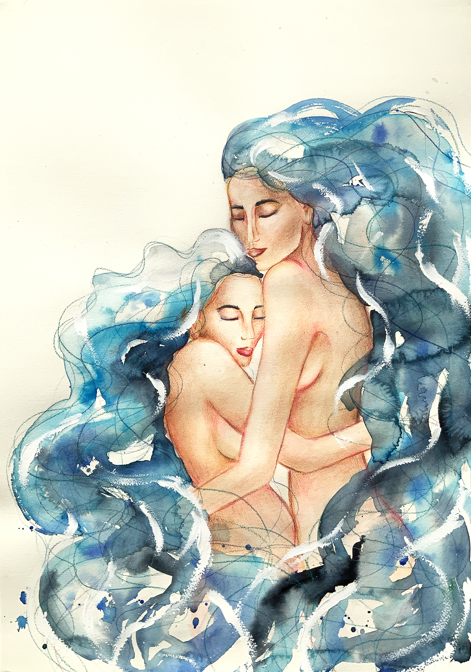 Mirror My Love, by Leni Kae –Â A figurative illustrative painting by Sydney artist-illustrator Leni Kae. Featuring a loving embrace between two nudes with flowing blue hair. It is symbolic of loving the self, and also a call for attracting a higher love that matches the way ones own heart gives love.