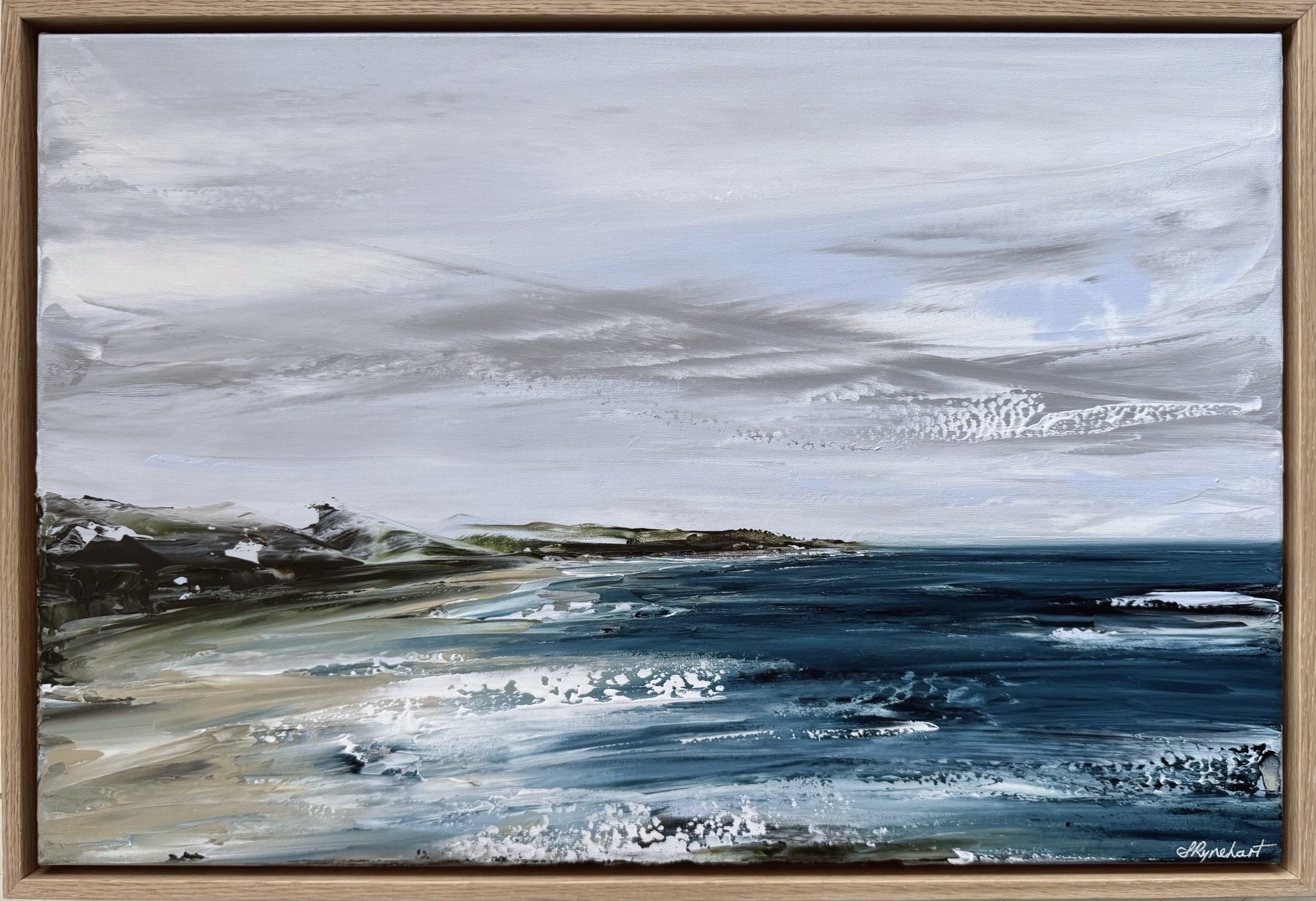 Reminiscent, “Missing You” came to life from a place of absence – of holding space for someone who is no longer near but forever present. The moody skies and restless sea mirror the turbulence of emotions, while the soft light breaking through speaks of hope, of remembrance, and of a love that endures…even from afar. “Missing You” is a special new artwork inviting pause and quiet reflection.