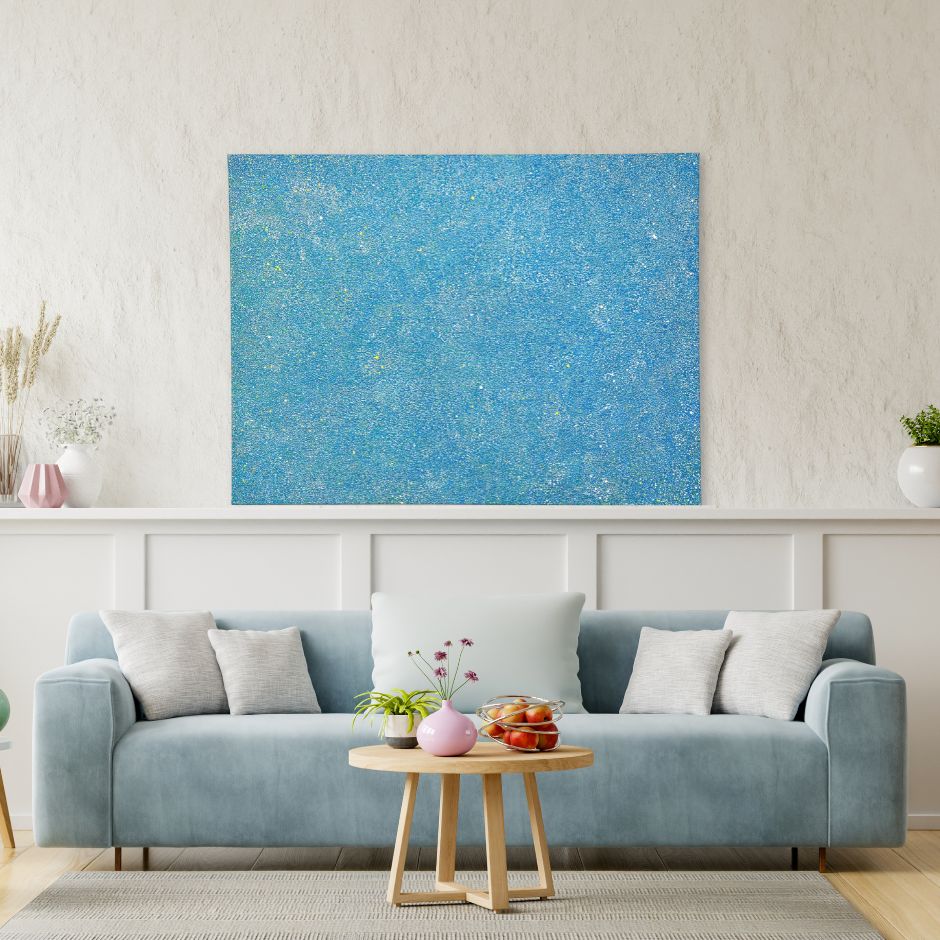 Mist Blue by Dessie O’Gorman – an original abstract painting featuring thousands of yellow, white and green dots on a sea blue background.