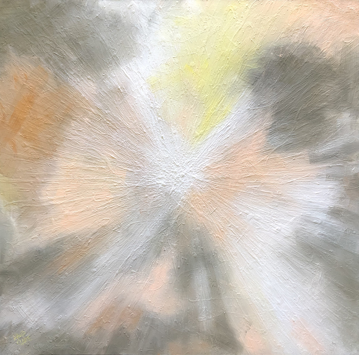 As I started blocking out an old painting with white and beige colours, I started adding a few more subtle tones to create a completely unplanned painting. I am always very wary of Yellow, but added just a touch to give it the boost it needed. With black painting around the edges of the thick canvas, the painting has a real glow to it. I liked these colours so much I went on painting over quite a few other old works to create a series. In this particular piece, the painting underneath was quite textured, so this has resulted in a very interesting contrast of the soft colours, and rough surface. It also draws you into the painting. It may not have all the colours of the rainbow, but it has all the class of Richie Benauds cream, beige, off-white sports jacket!