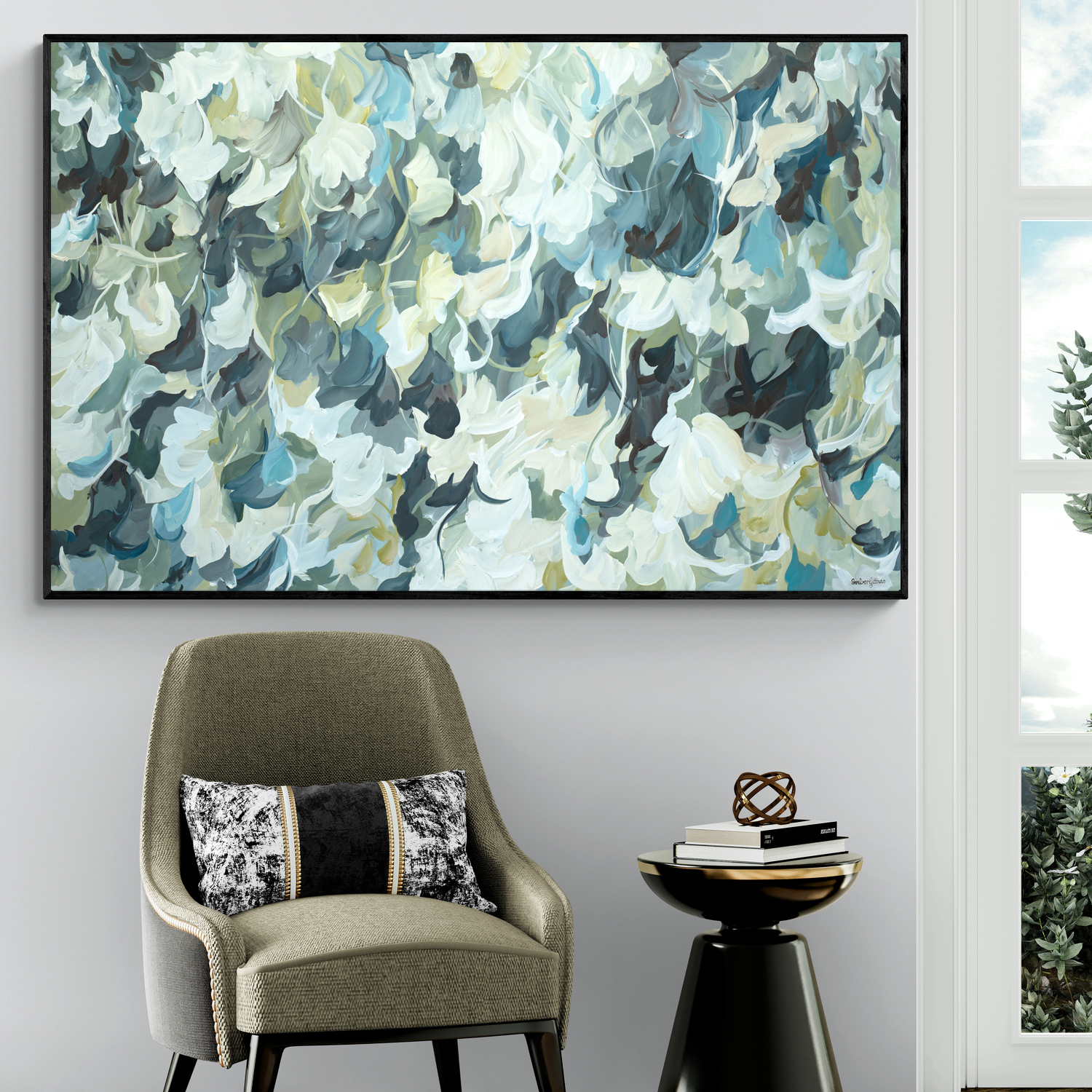 A gorgeous modern statement piece of art that encompasses elements of nature and the tranquility that nature brings into your home. This stunning large abstract original painting is inspired by the calming elements of our natural world, highlighting the movement and freedom within. Elevate your room with a modern style with a contemporary minimal colour palette of blues, whites, adding soft touches of green and yellow. Gorgeous modern tones that will never go out of style.