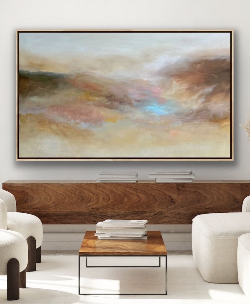 Misty Emotions is a painting celebrating light of the Australian landscape. A very soothing and tranquil painting where sky, clouds, come together to create this beautiful harmonious landscape. Capturing the beautiful colours of the Australian landscape , browns, ochre and light pastels against the light colours of the sky. Clouds covering the hills and capturing the beautiful rhythms of the landscape .Painted in a very expressionistic way with acrylic paints, with lots of layers of paint . I tried to create so much depth in the painting .A very harmonious composition of colours and forms that makes it a soothing painting . This painting does not come with an external frame.The painting is signed and dated at the back and comes with a certificate of Authenticity.