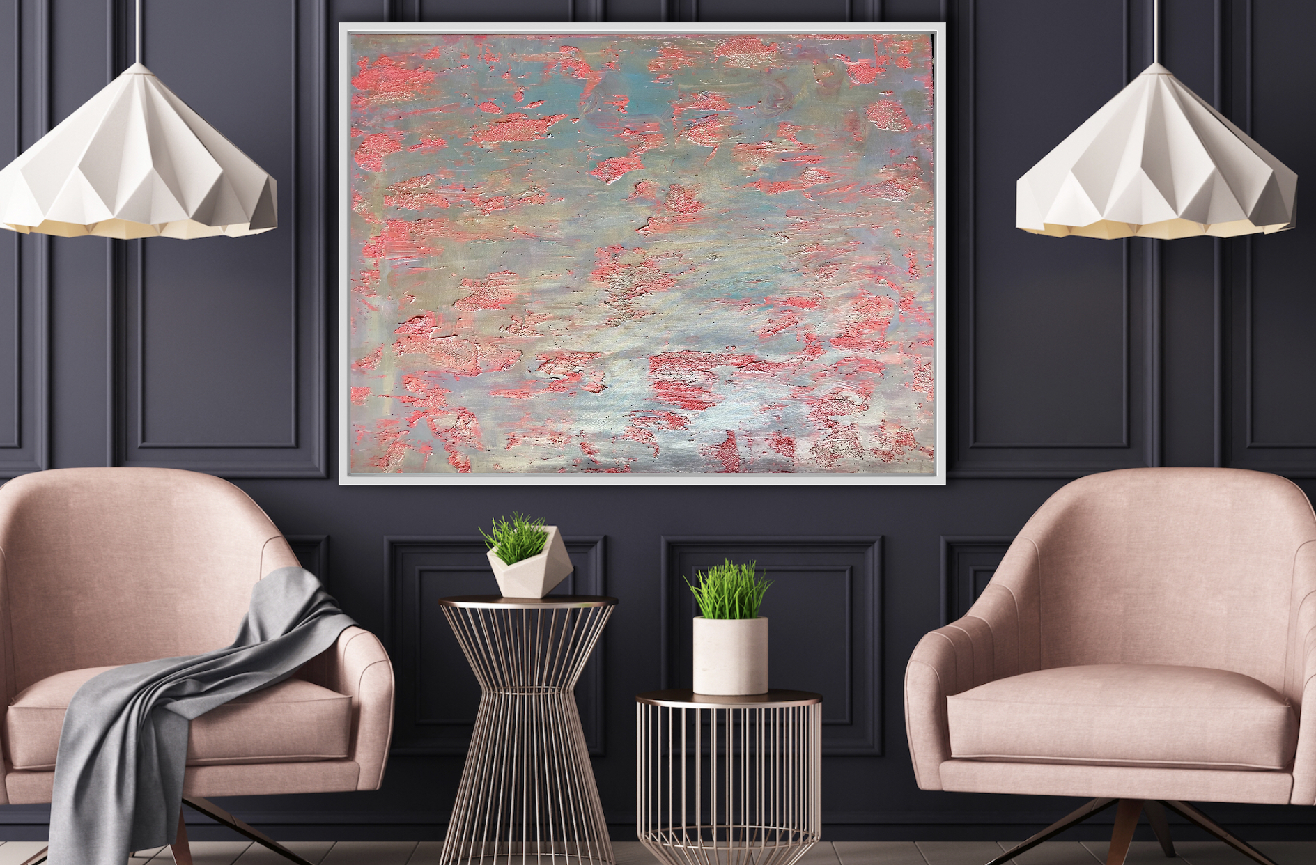 This paintings has richness of beaded texture, coarse texture with pinks, rose pink, metallic silver and blues, greens are used in muted tones.