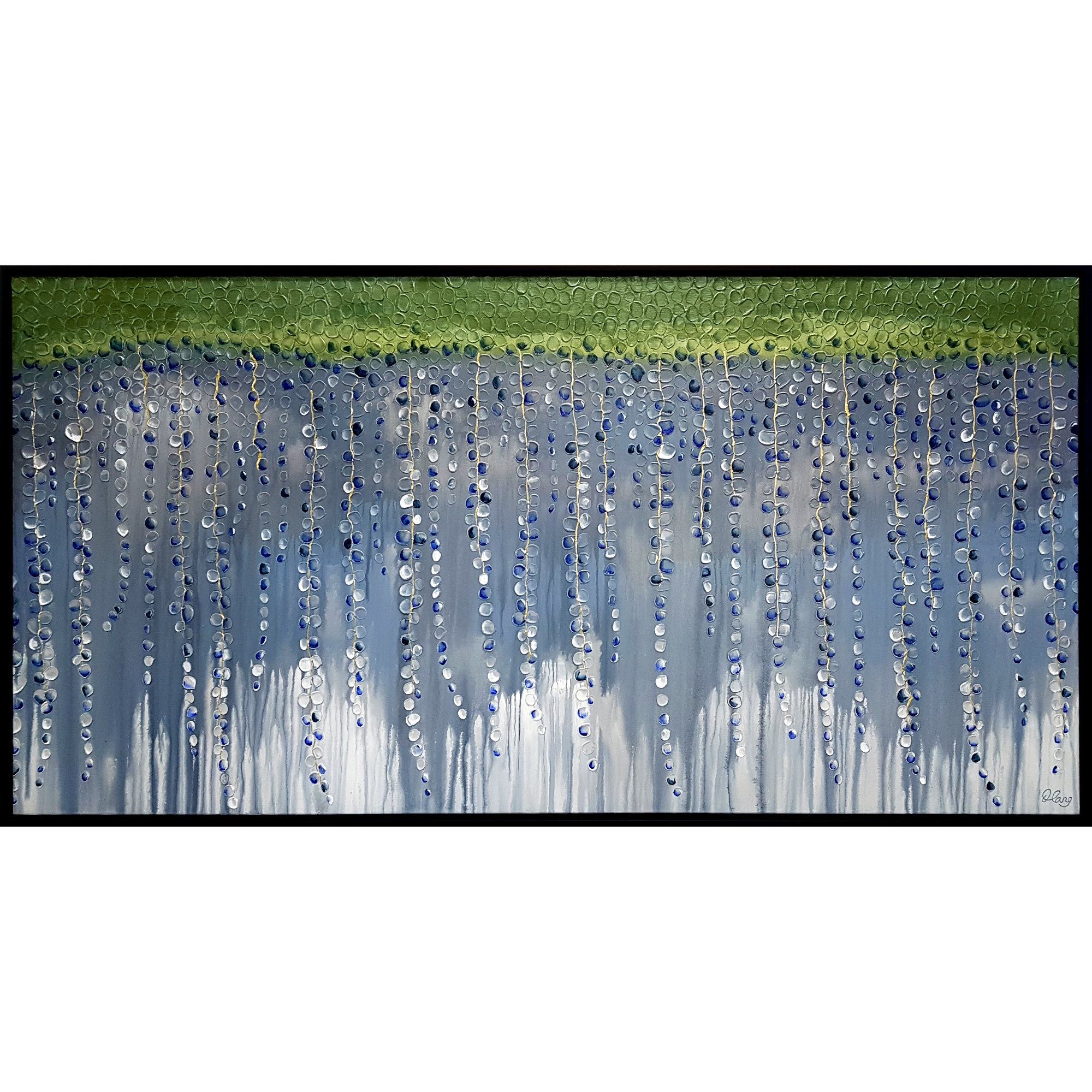 Hand painted on stretched canvas with a beautiful misty grey and blue palette it has heavily textured impasto Wisteria petals and leaves on gold leaf vines.