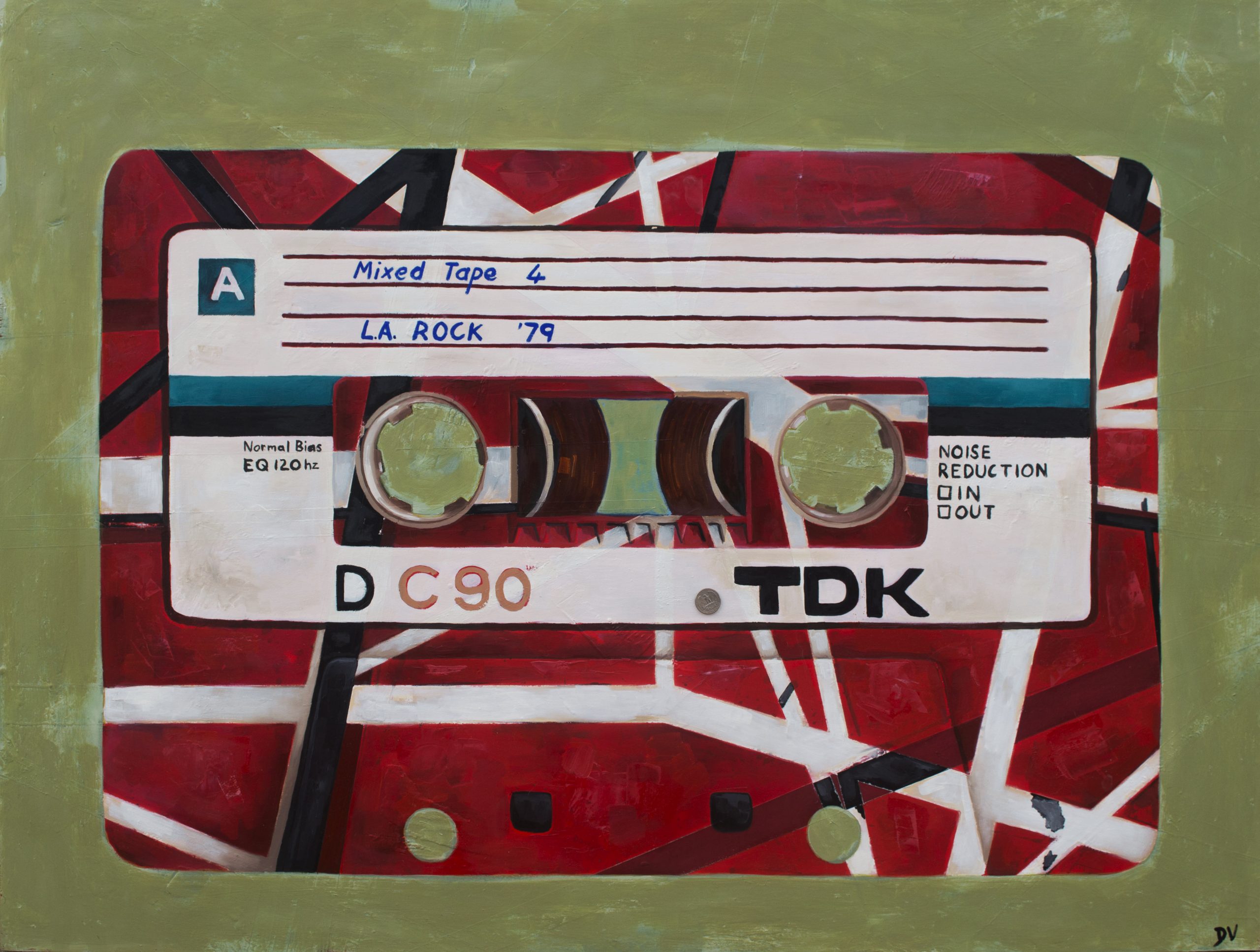 Mixed tape is another in the realist style. Painted in several layers over the course of several days. It is eye catching and really pops! I wanted to give the work a semi abstract background with texture in some areas to give a slightly aged effect.
