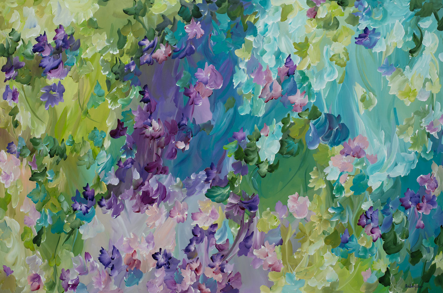 Moments in Time by Amber Gittins – 150x100cm Extra large colourful abstract painting. Inspired by the movements and calmness of a beautiful flower garden and the gorgeous colours that make up a floral garden. A stunning colour palette of natures greens, teals, purples in a flowing floating calming pattern.