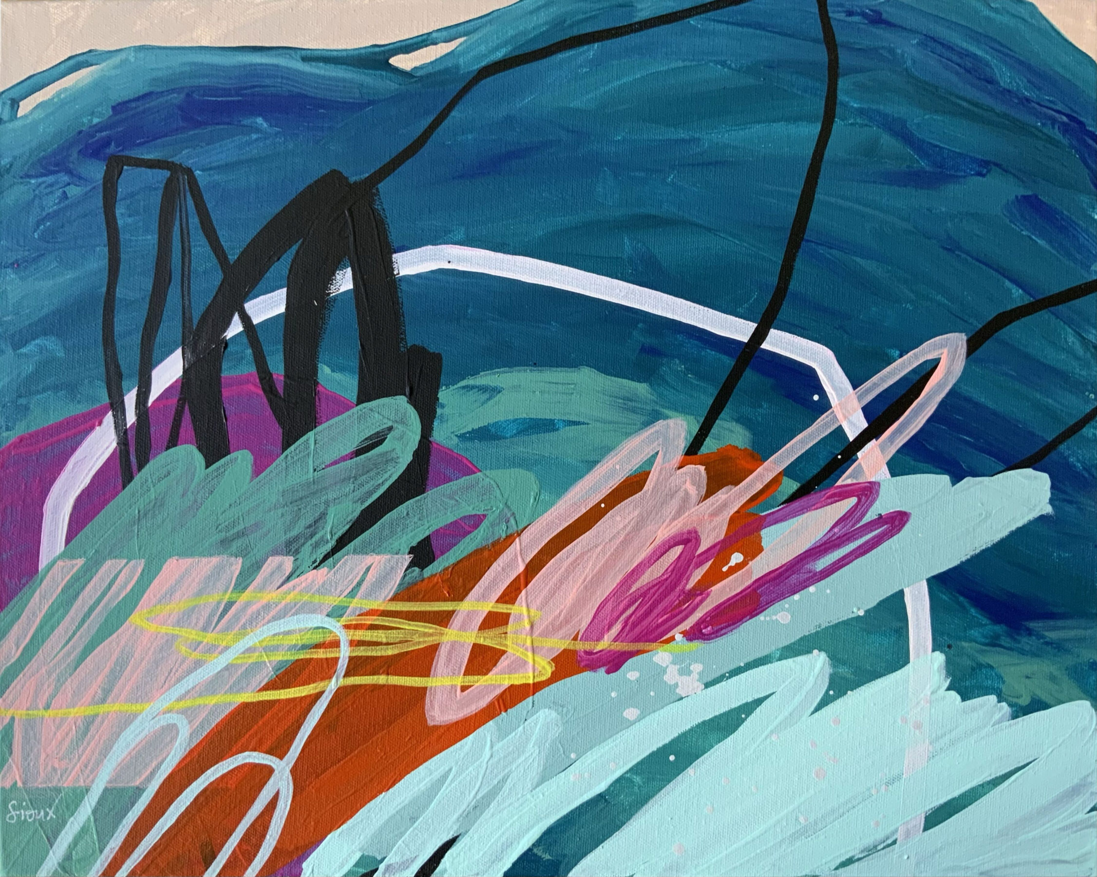 Influenced in part by the ocean, which never ceases to inspire and delight. This is one of a few small paintings I’ve been working on in the studio in between big public art projects. Changing in scale from painting a 50m long mural on the road to this small canvas was a challenge. Instead of painting with a 270mm roller and using my whole body, I used tiny paint brushes, each stroke being quite deliberate. So while it is an abstraction, there are many considerations such as palette, form, scale, composition, line etc. Enjoy!