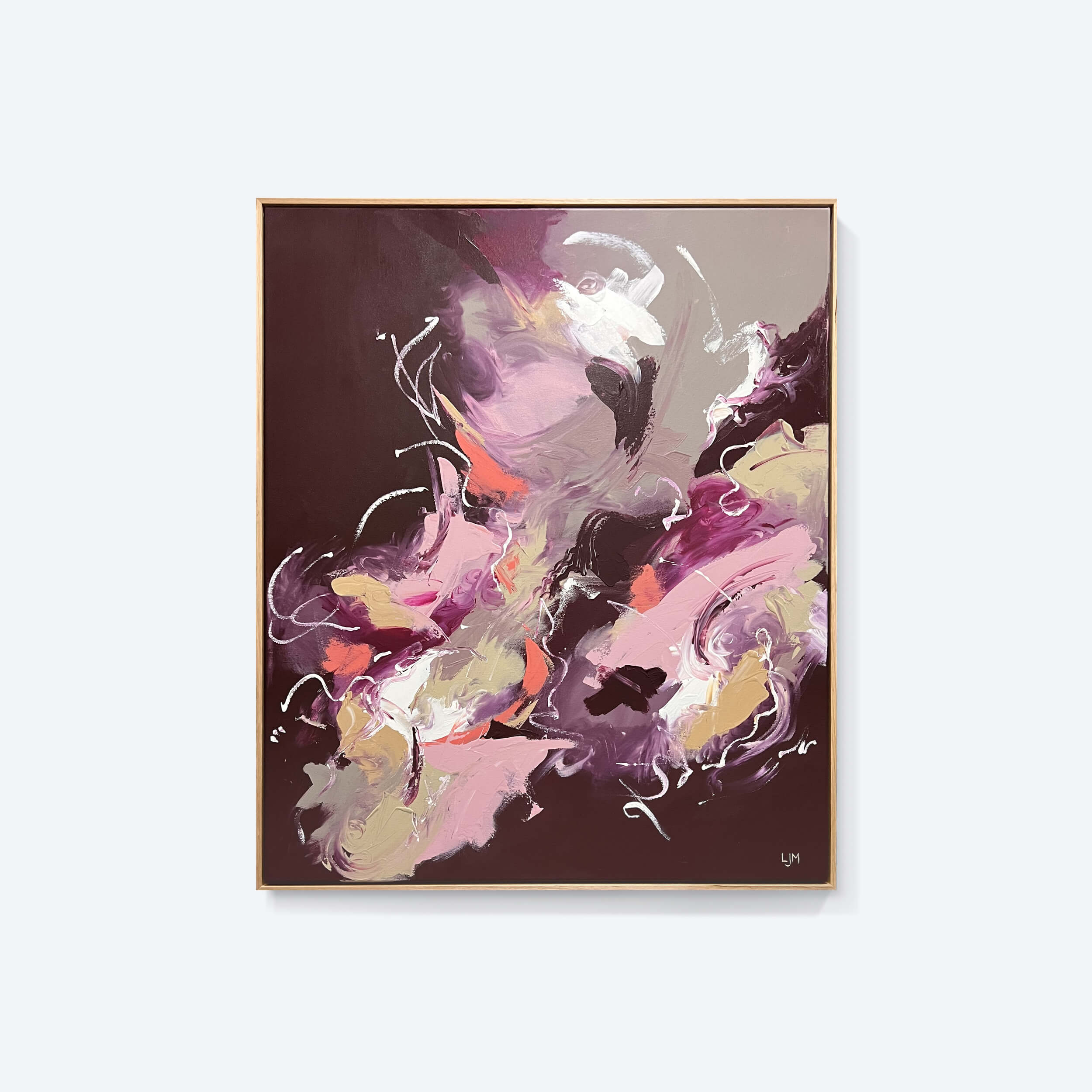 100cm x 120cm premium acrylic on 12oz cotton duck canvas with a Tasmanian Oak timber float frame. Signed on both back and front and includes a certificate of authenticity. Shop statement abstract art at Lee J Morgan.