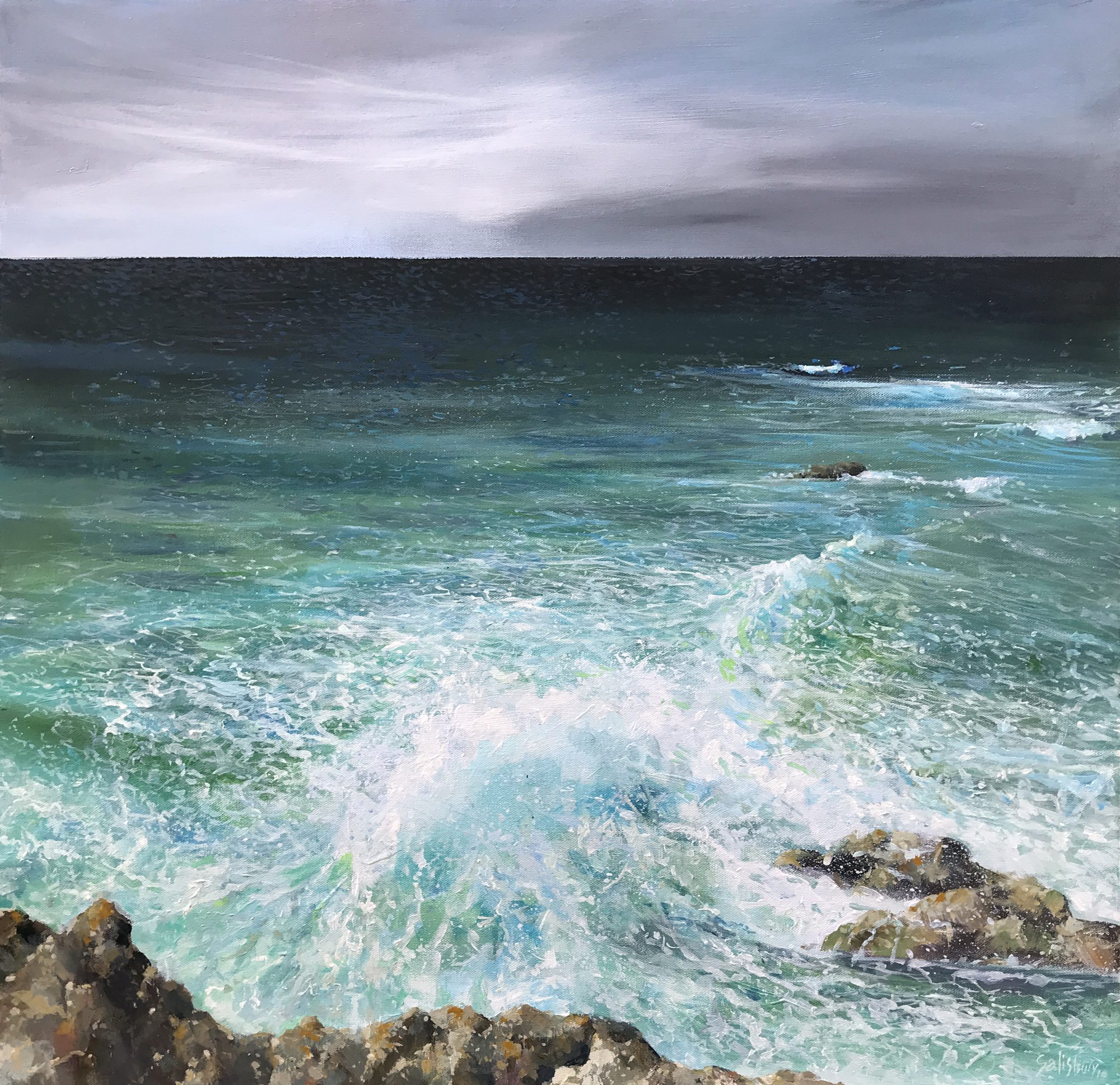 “Momentum,Take II” is a work from North Stradbroke water series, focusing on moody oceans. My love affair with the ocean, mainly through many years of surfing, comes to the fore.