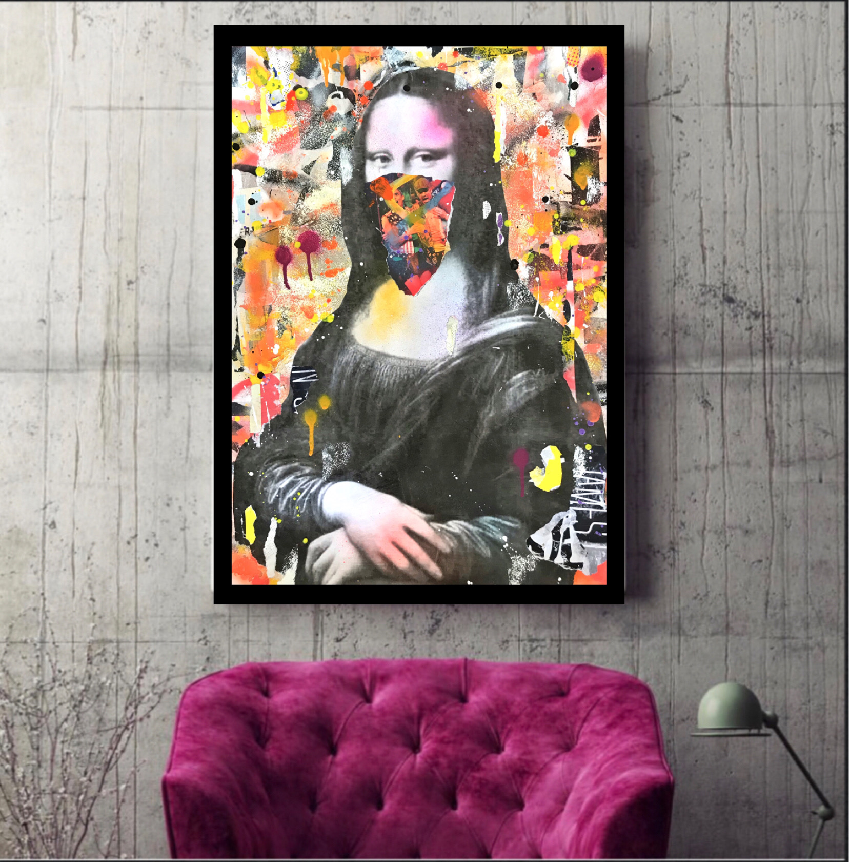 The background was built up with layers of paint and paper before the main image of The Mona Lisa was added and overlaid with paper and paint and given the most essential fashion accessory in the modern world, a face mask.