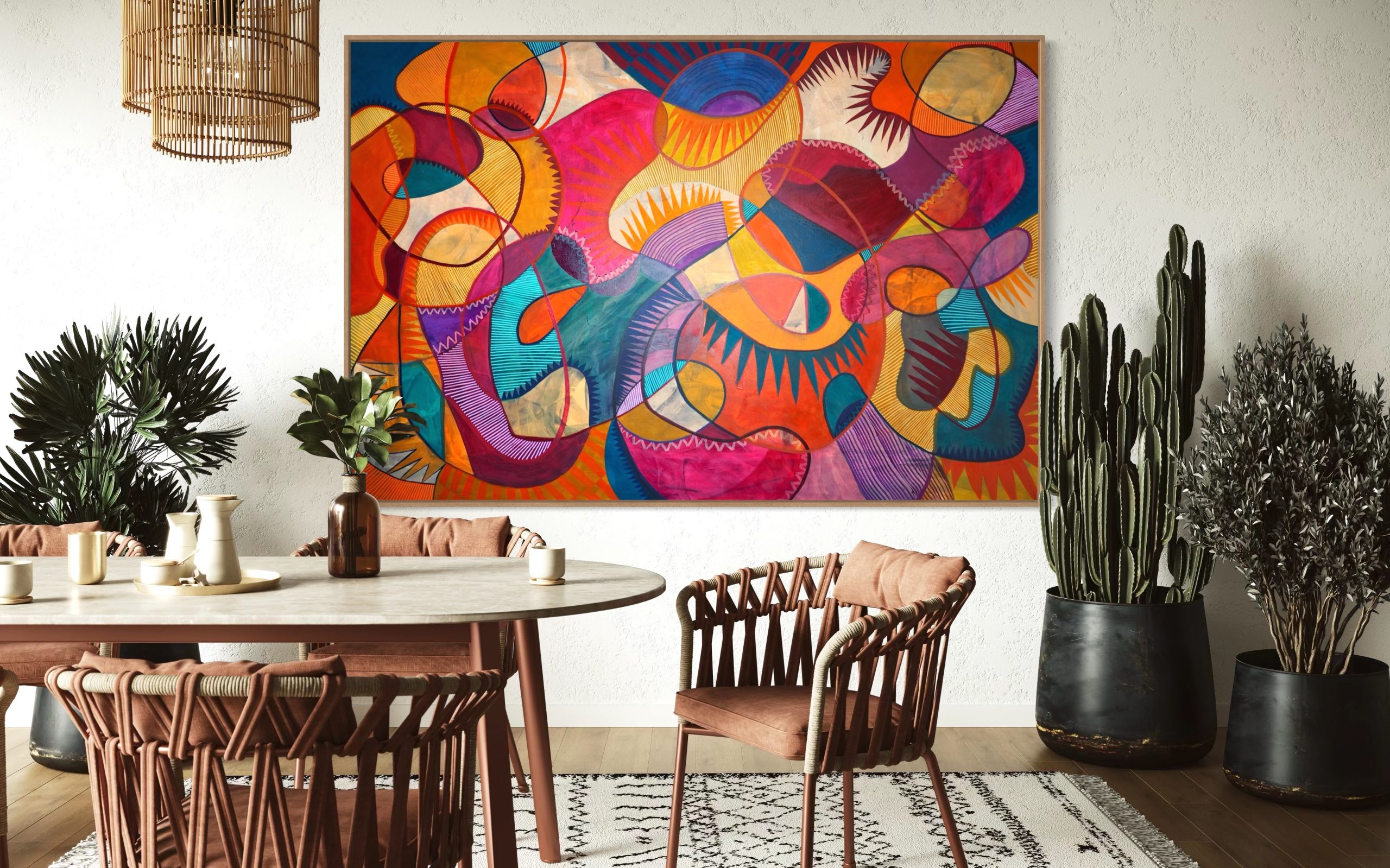 Echoing the music of a masquerade in motion — where identities shift and bravery takes centre stage — Monarch of the Masquerade is a dynamic abstract piece that embodies confidence, mystery, and transformation. Organic shapes intertwine and flow across the canvas, while layers of rich texture and intricate line work create a sense of hidden depth, mirroring the duality of courage — both the face we present to the world and the quiet strength within.