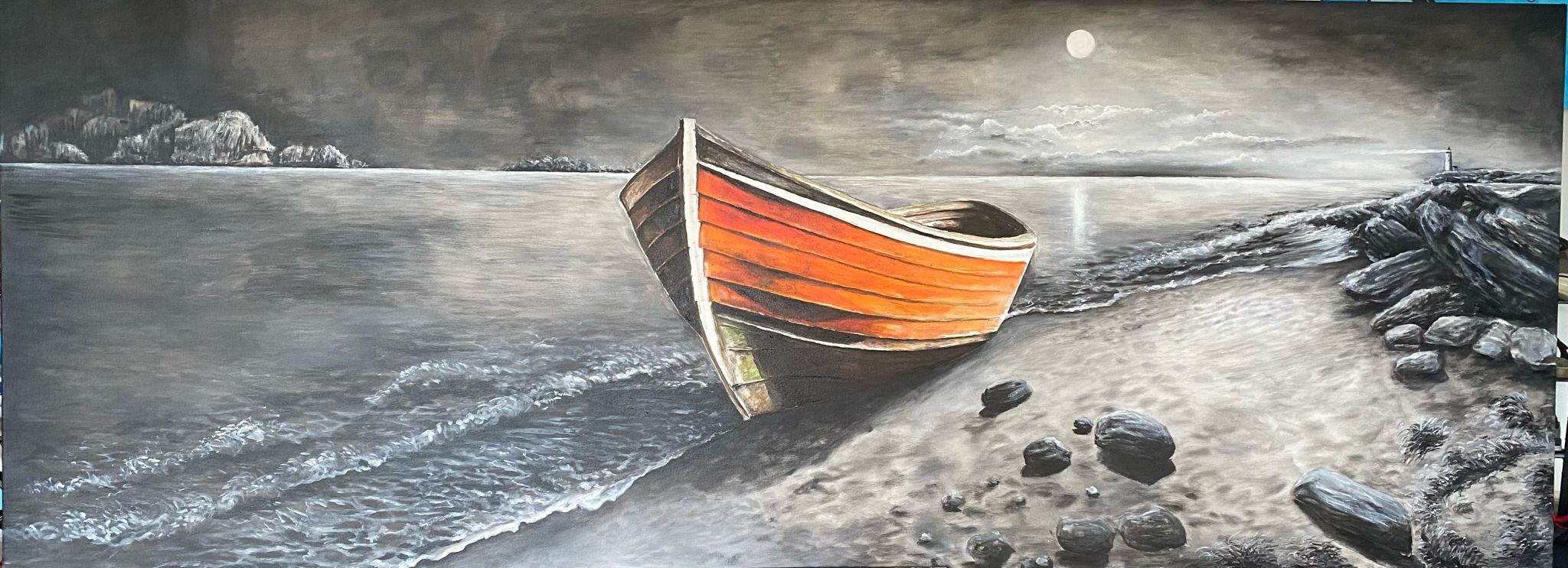 In the serene expanse of a monochrome sea, a solitary boat drifts with graceful abandon. The somber hues of grey and charcoal cloak the waters, evoking a sense of timeless tranquillity. The boat, a beacon of solitude, rested in the sand, its silhouette a stark contrast against the kind of night muted backdrop. Each brushstroke captures the essence of quiet contemplation under moonlight.