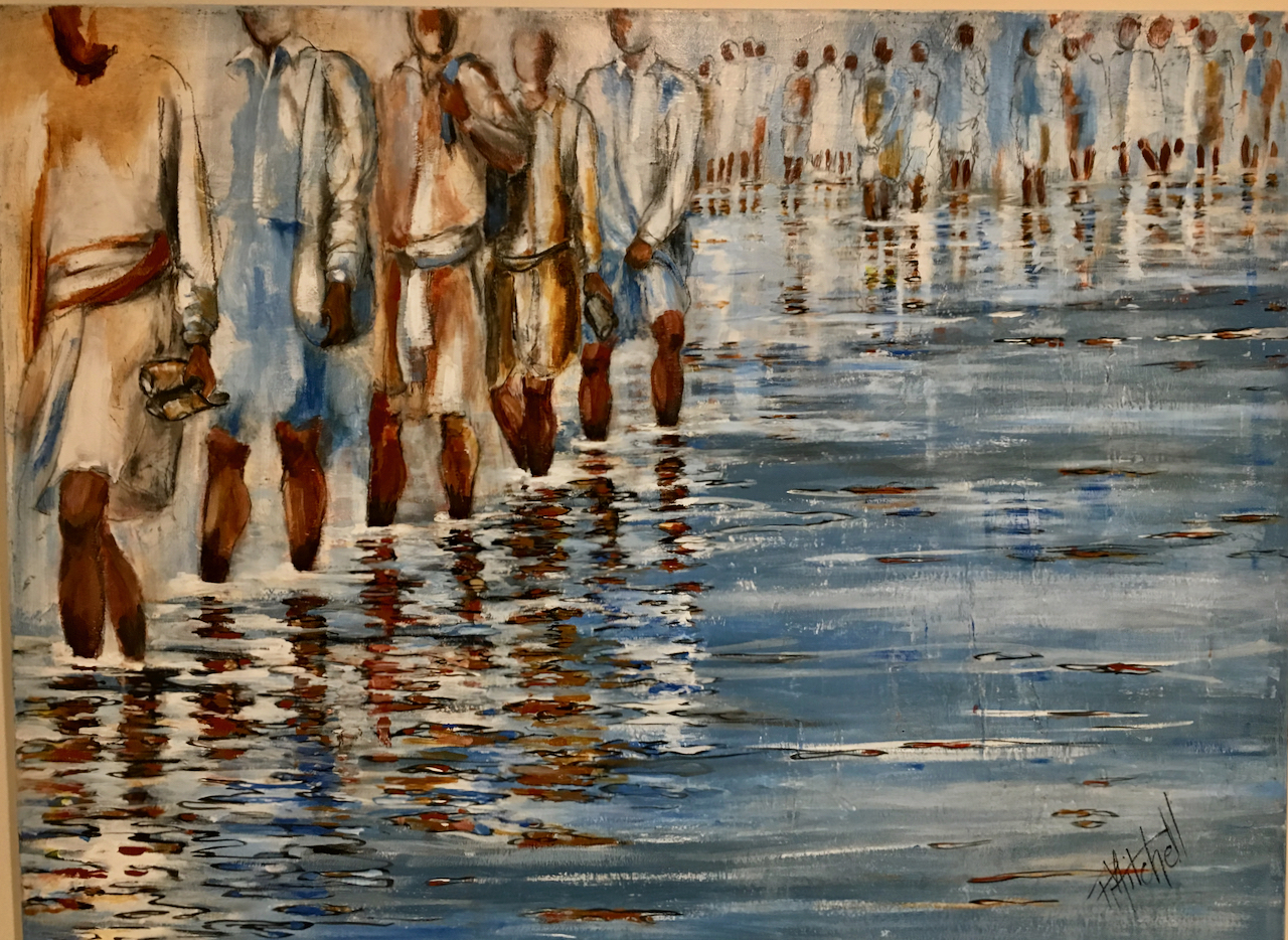 Charcoal is used to denote the figures after the acrylic underpainting as is my usual process. I then add more acrylic paint and some texture to show the watery effects.