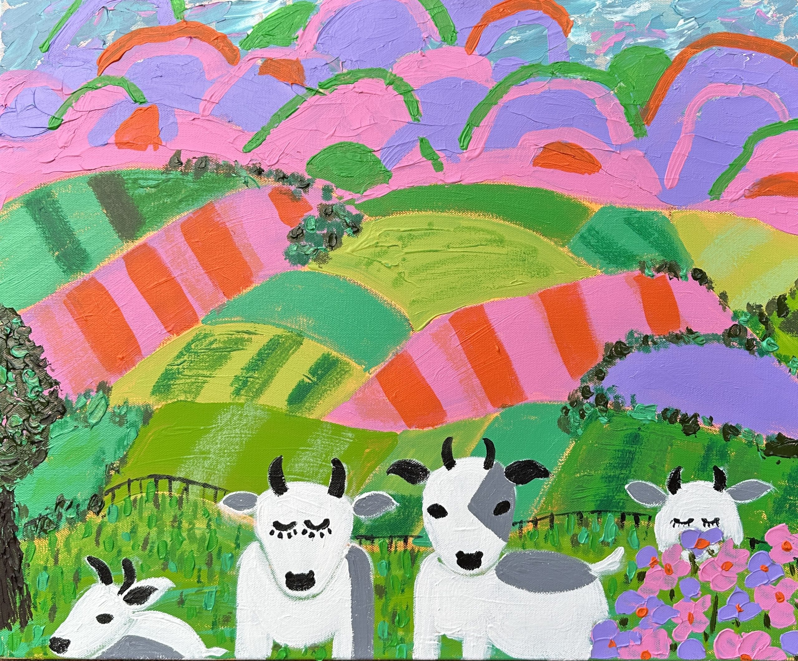 This vibrant and whimsical painting features a dreamy countryside scene bursting with colour and charm. Rolling hills in bright, playful shades of green, pink, purple, and orange stretch across the canvas, forming a patchwork landscape under a pastel sky. The hills are stylised with bold, sweeping brushstrokes, adding a sense of rhythm and movement.