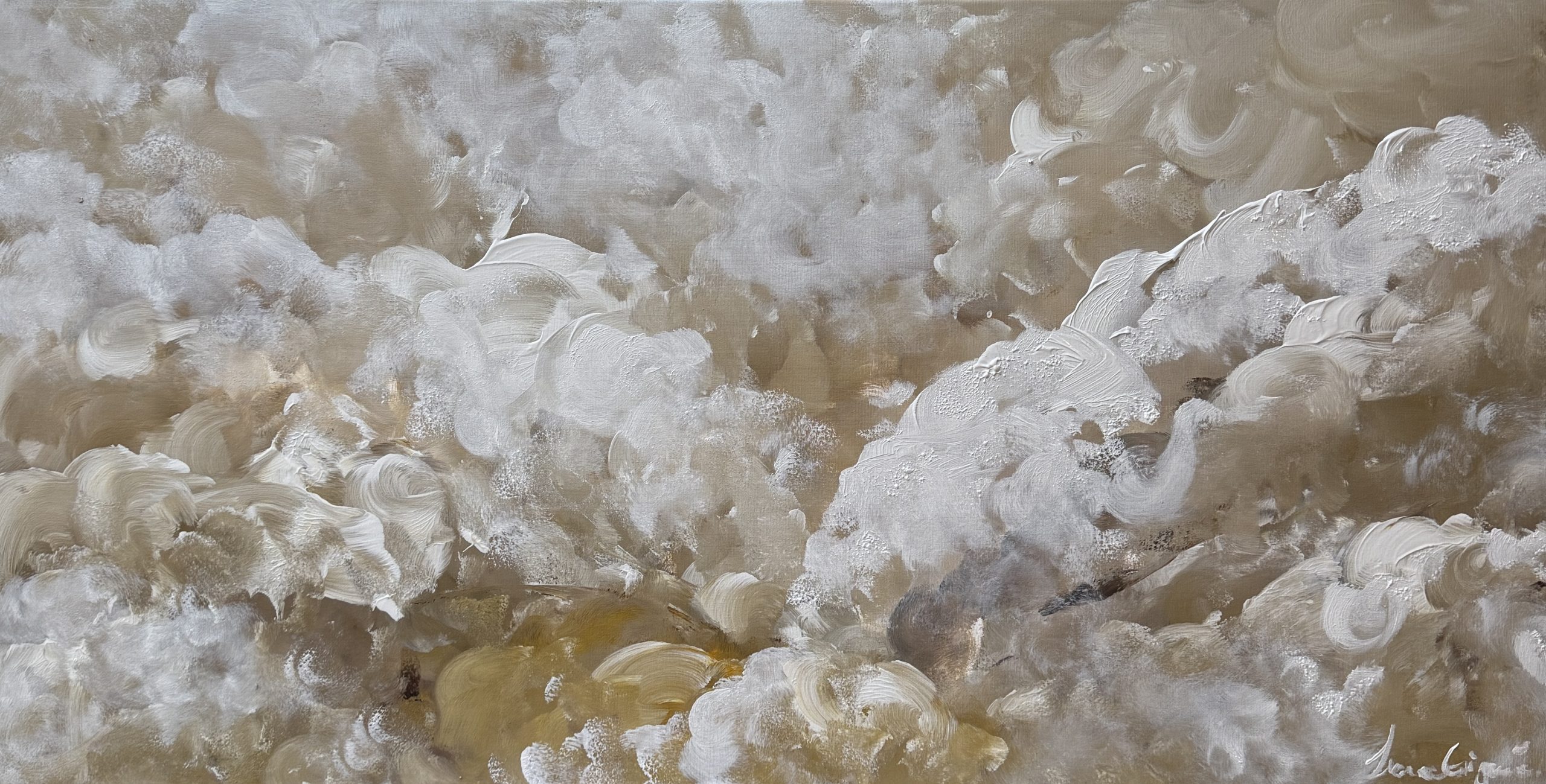 This abstract piece evokes a gentle landscape of clouds or ocean foam, blending creamy whites and subtle golden tones. ‘Moonlit Sand’ brings a sense of grounded tranquility to any space.