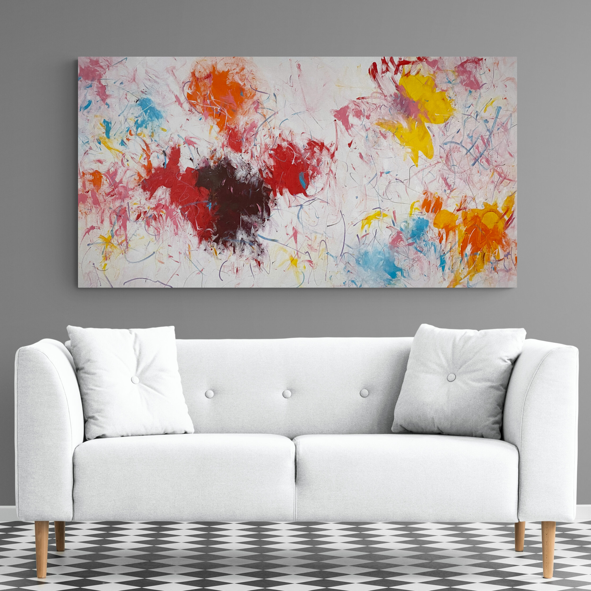 Enjoy roaming this latest expressionist piece ‘More Love From Me 2 U’ and its vibrant multi-coloured palette of of warn orange, yellow pinks and red with cool light blue and hints of violet.