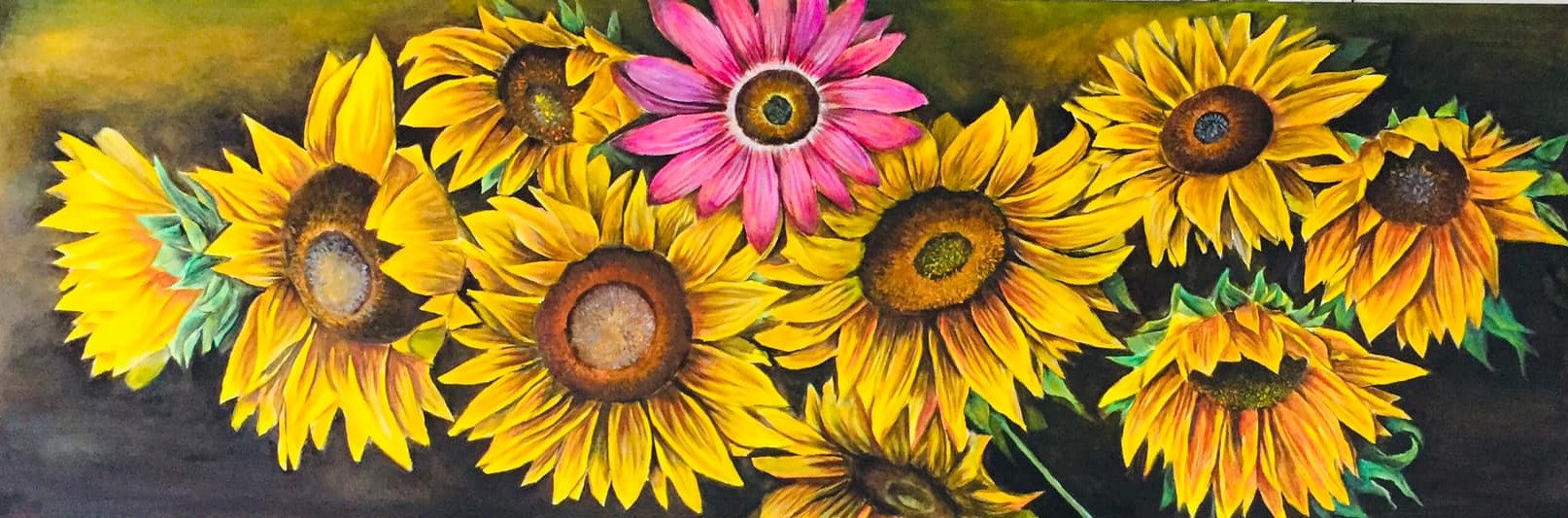 Morning Blossoms by Mahesh Aluthge – The vibrant Yellow colors of blossomed sunflowers on a dark background created a remarkable realistic view with a a magenta color daisy flower made a bit of a difference to the yellowish look of the whole art.
