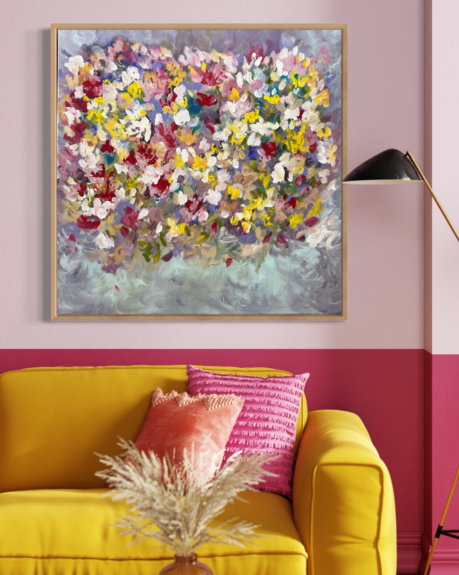 My abstract artworks especially with floral impressions from memory complete my creative journey, making it soulful and I believe that fulfilling experience can be felt in my works freely. I love painting with vibrant colors, using hands and loose strokes of brushes, palette knives and unusual tools of craft in the process of layer building. These play an amazing role in enhancing the depth of composition.