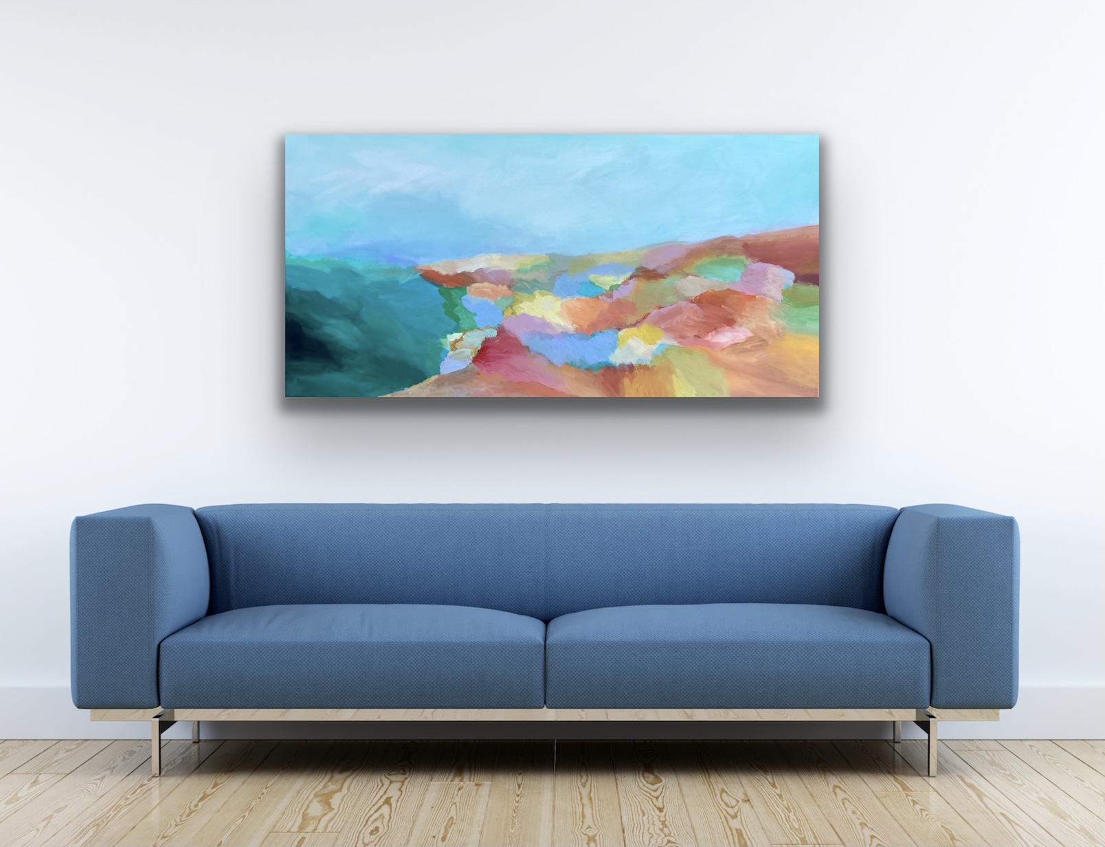 Morning has Broken by Theo Papathomas a painting celebrating colour and light. A very soothing and tranquil painting where sky, clouds, water come together to create this beautiful harmonious landscape. Capturing the beautiful warm and cool colours of the landscape against the light blue colours of the sky. Morning light and clouds covering the hills creates this misty and fresh feeling. Painted in a very expressionistic way with acrylic paints . I tried to create so much depth in the painting .A very harmonious composition of colours and forms that makes it a very poetic and romantic painting . The painting is signed and dated 2021 at the back and comes with a certificate of Authenticity.