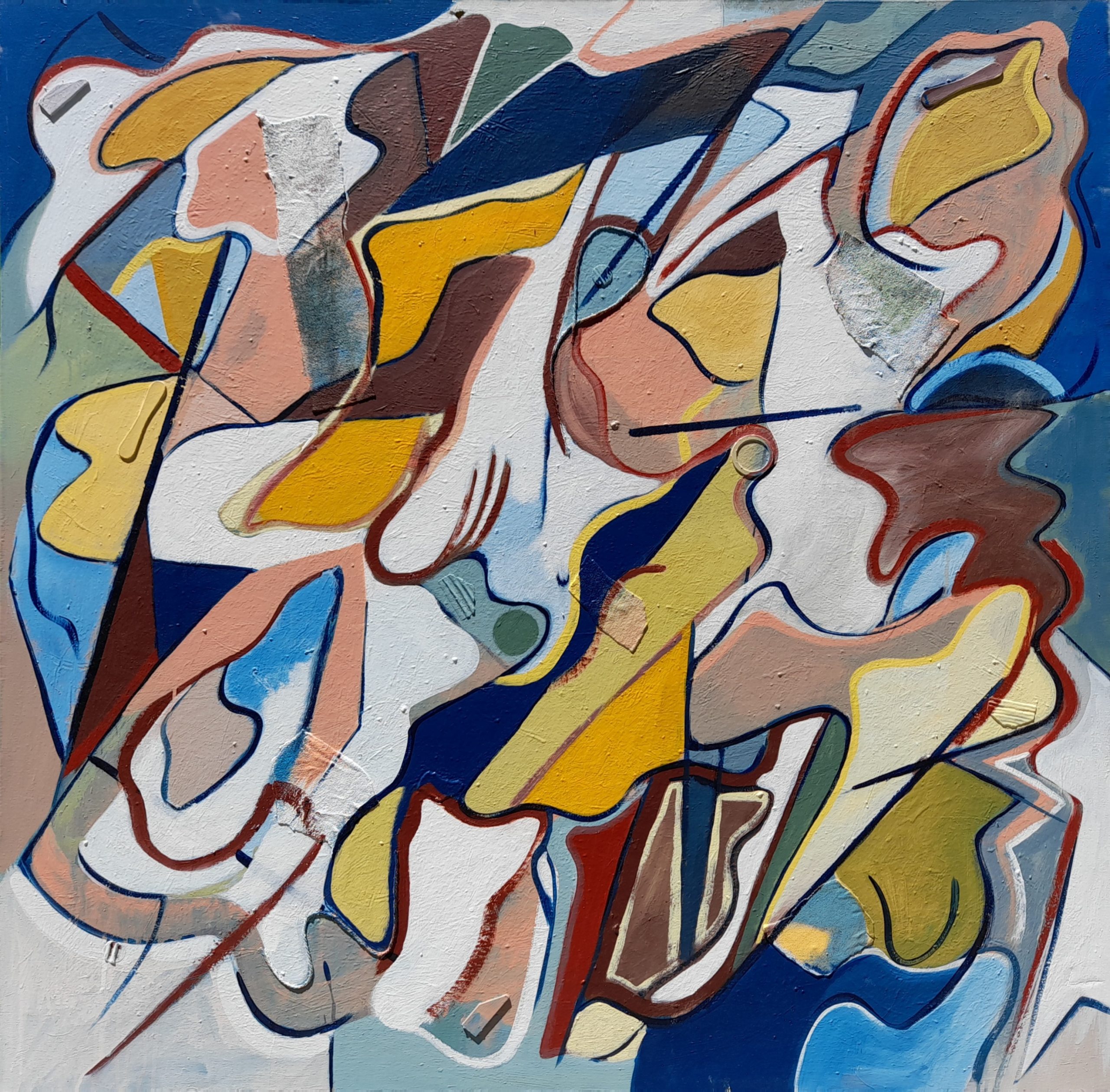 Mixed media – acrylic fabric and string on stretched canvas