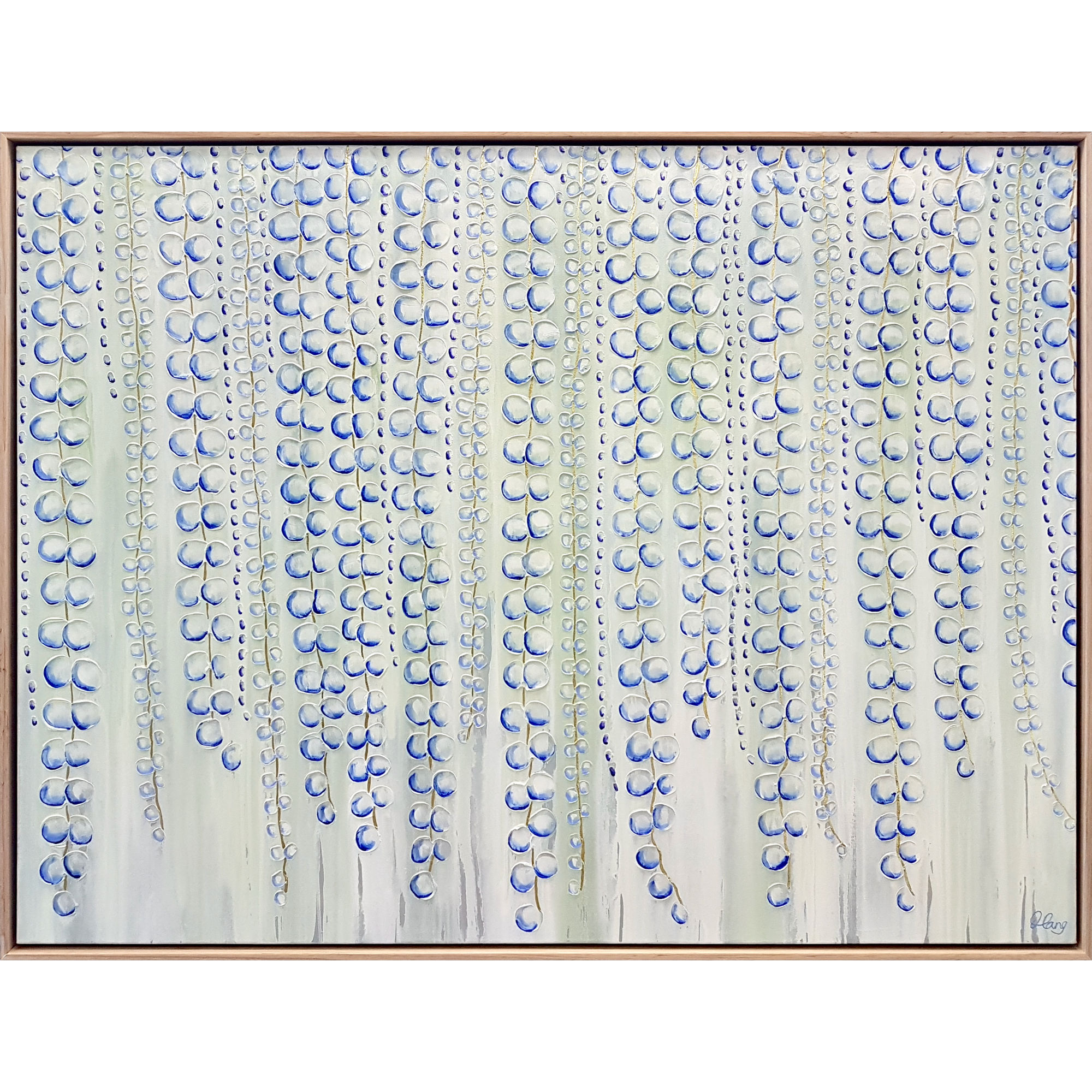 Hand painted on stretched canvas with a beautiful soft misty grey, white and green washed background it has heavily textured impasto Wisteria petals painted shades of blue on gold leaf vines.