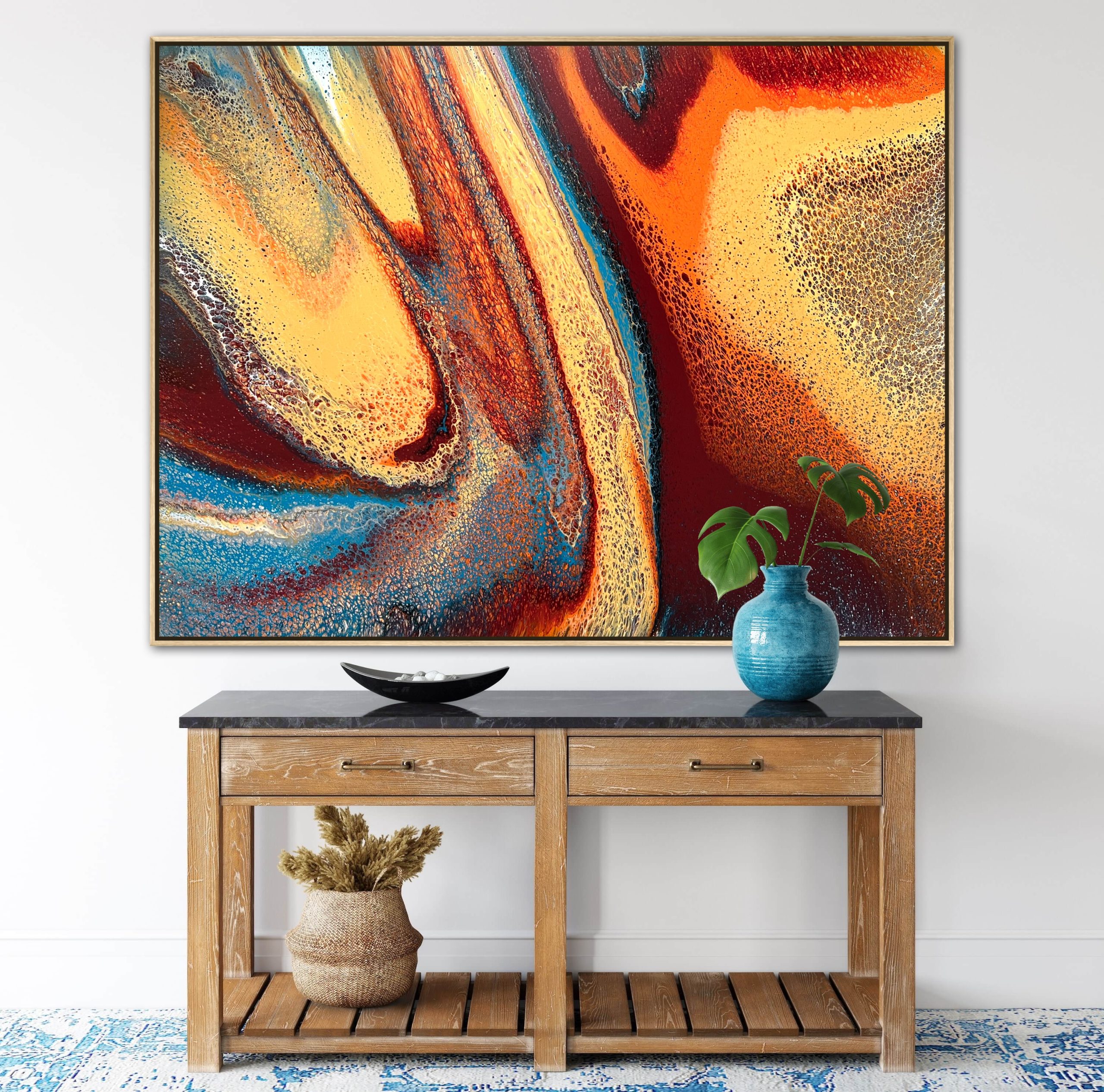 Morning Oasis was created using various techniques combined to allow increased flow, interaction and separation of colours to create interesting patterns where pops of colour can be seen emerging from underneath. This added dimension adds lace and cells to the artwork creating an interesting and one of a kind painting that can never be replicated.