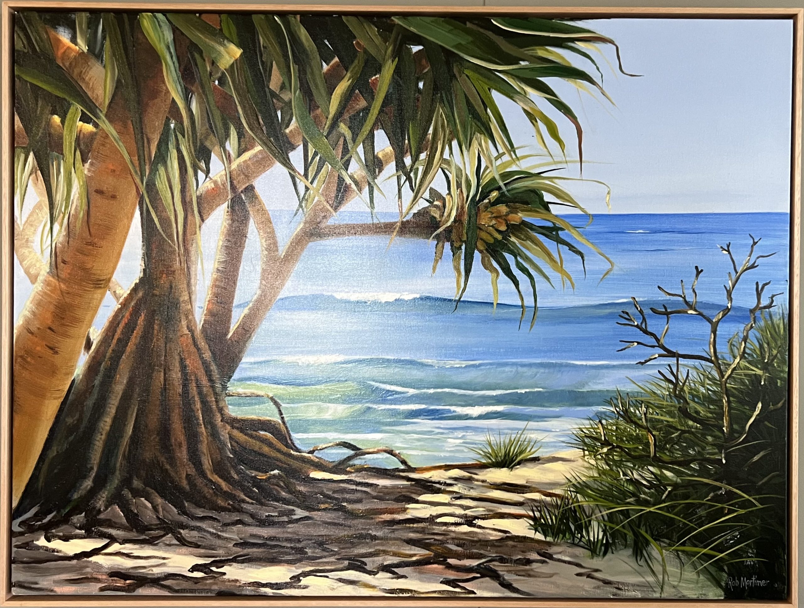 Morning Serenity by Robert Mortimer – inspired by the early morning light through the pandanus palms at the beach.Original acrylic painted on quality stretched canvas with raw timber frame. Clear top protective coats painted with brush.