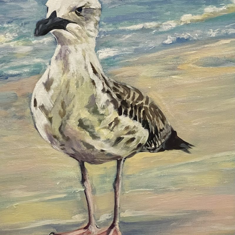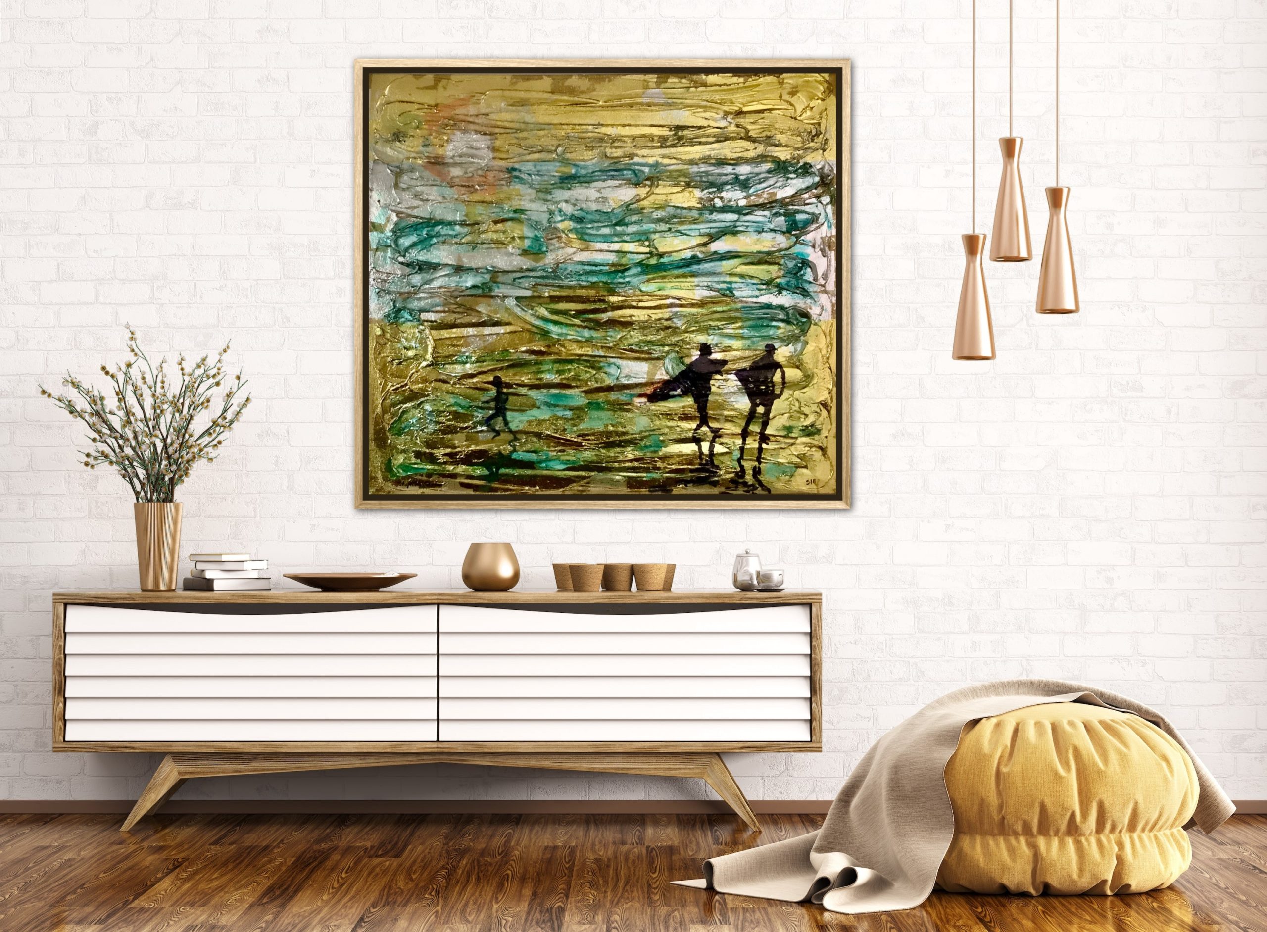 Morning Surf by Stephen Baxter depicts two friends strolling down to the waters edge chatting as the sun reflects and glistens across the crystal clear water. A highly textured artwork with gold and silver metallic leaf giving the work a glistening, sparkling quality that moves as you walk past the image.