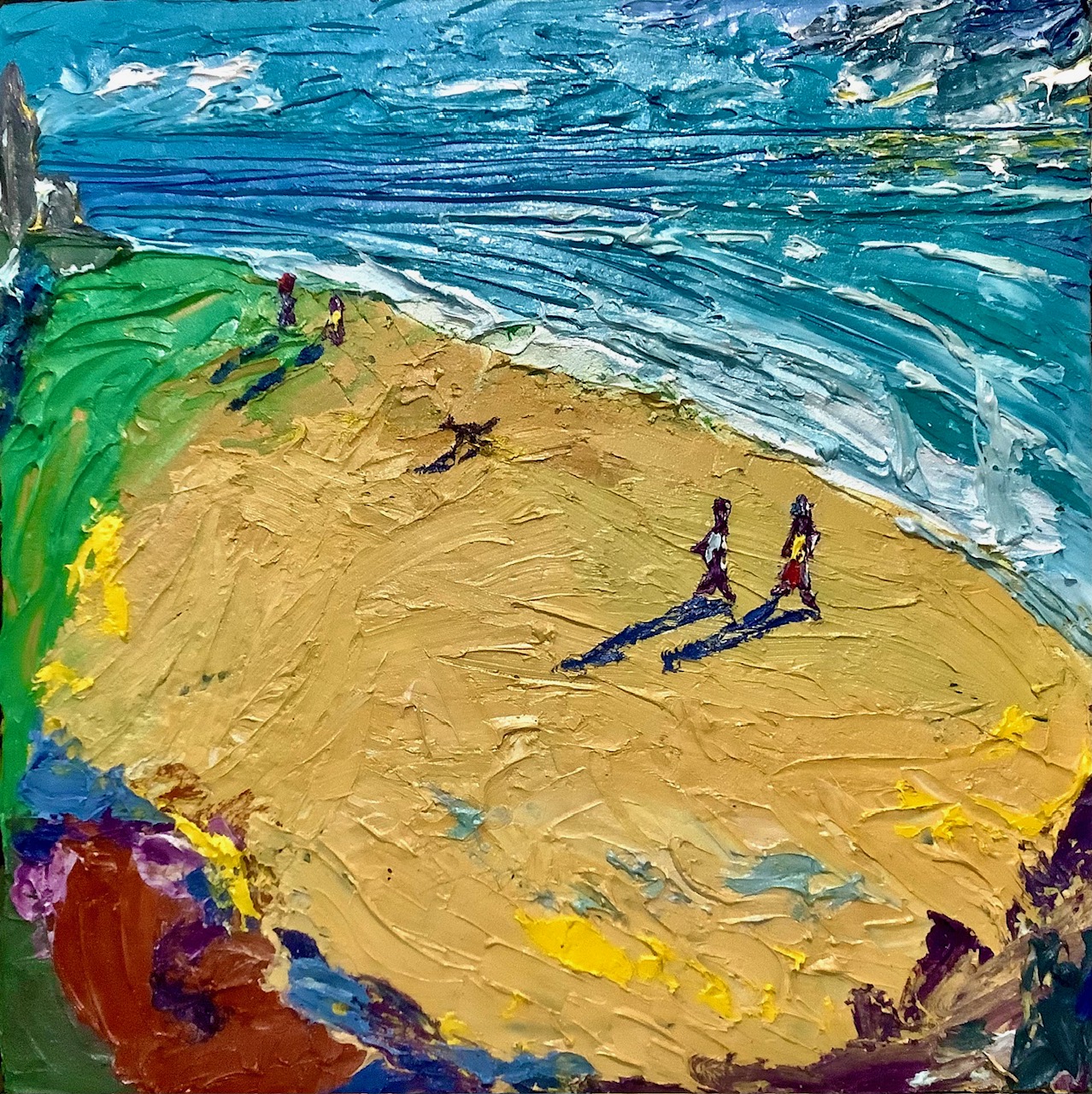Morning Walk by Stephen Baxter captures a moment in time we all treasure. The artist’s intention when creating this highly textured painting was to create depth and movement by using quick and spontaneous palette knife markings. The surface of the painting is coated in a clear archival glaze with diamond dust embedded into the lightfast clear. The work sparkles like light on water as you pass by the painting.