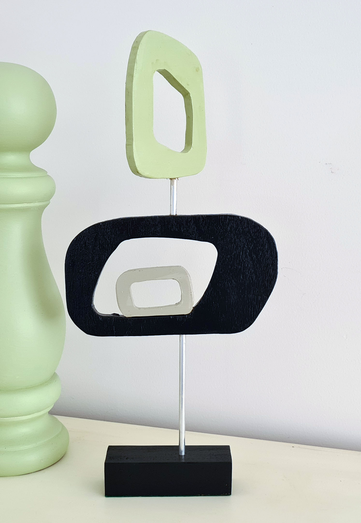 Cool avocado green, soft grey and pops of black. Â Various shapes and circles make a peaceful and chilled sculpture.