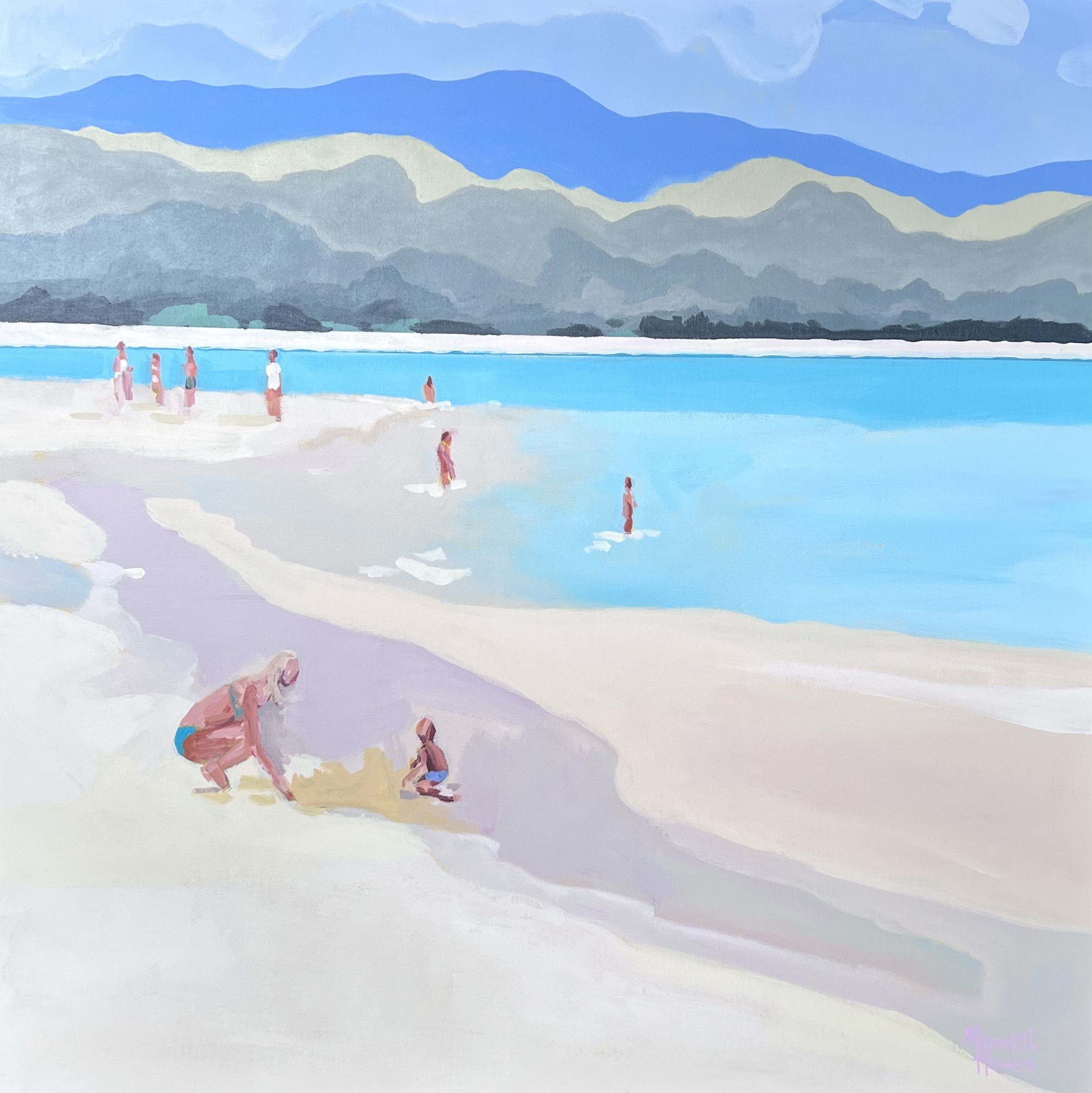 ‘Mother and Child at Lanikai Beach’ by Meredith Howse, beautifully captures the summer time feel of fun at the beach. The artwork portrays a mother and child building sandcastles.