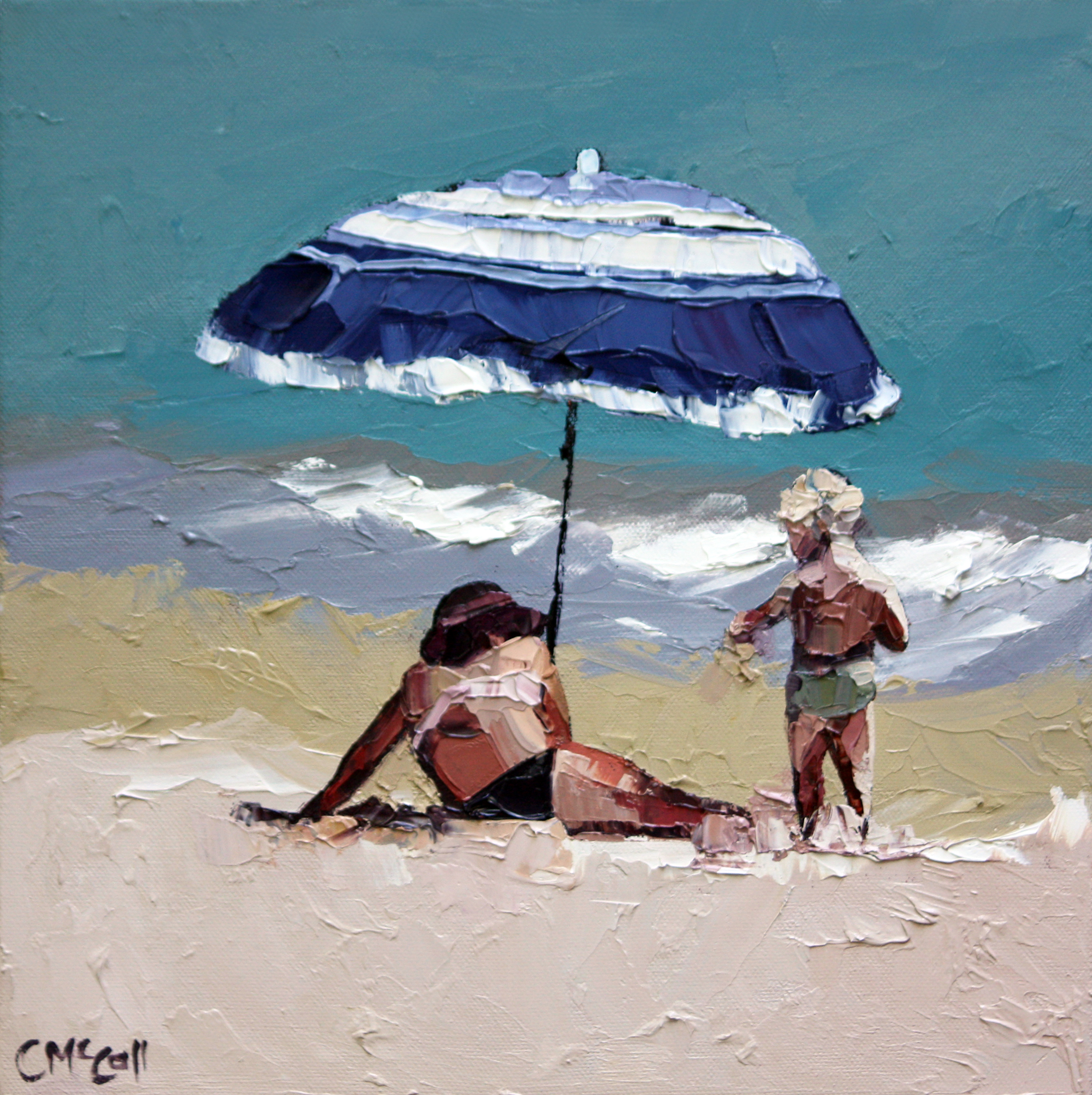 Celebrating endearing memories of the beach, ‘Mother and Son’ is completed with a palette knife to give texture, bold colour and movement.