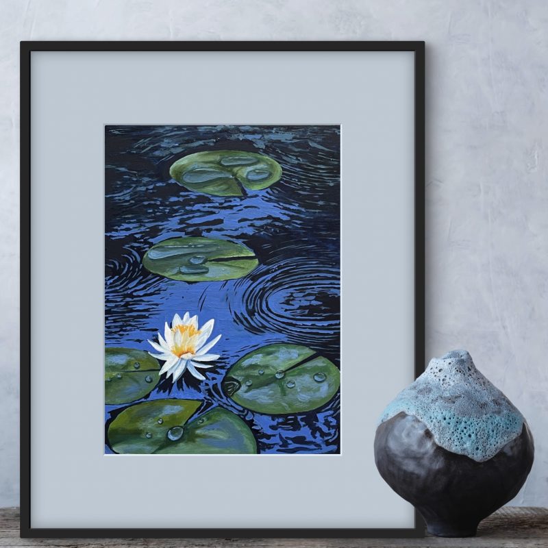 This artwork was created on Recycled Paper glued down to cardboard and overlaid with Acrylic Paint, Spray Packs, Paint Pens, Pencils and finished off with Rose Gold Leaf. This work comes in a white frame & mounted under a clear perspex sheet.