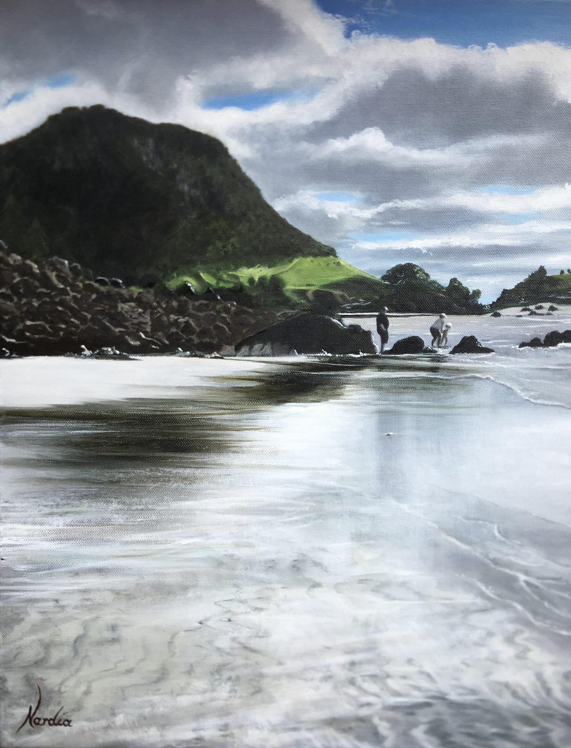 While on a holiday in NZ I visited this gorgeous region, and photographed Mt Maunganui beach as the sun shone silvery like, on the wet sand. I couldn’t wait to get home to my paints and studio, to recreate what I had seen with paints on canvas.