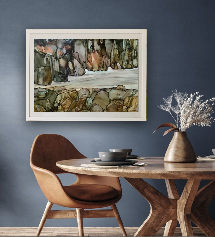 The medium used is professional grade inks hand-painted onto Yupo (a durable polypropylene paper). The colours emerge and blend beautifully in an atmospheric artwork with strong drawing elements.