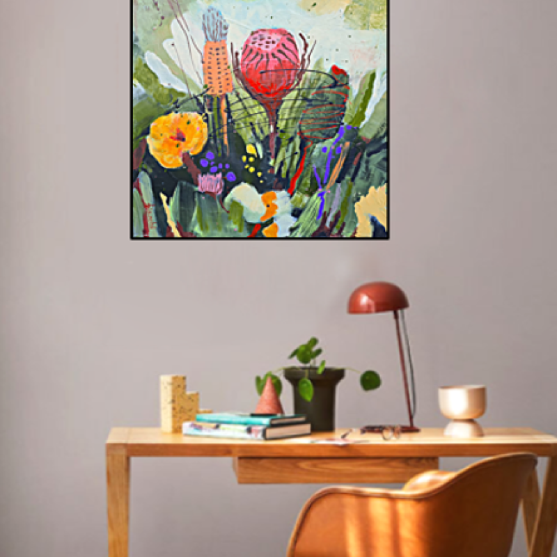 Inspired by the incredible diversity of the Australian landscape from its rugged coastlines, snow-capped mountains and the idiosyncratic landscape of the sandy desert with its sun baked monoliths and rainforests. The painting continues on the edges and comes with professional wire hanger and a Certificate of Authenticity.