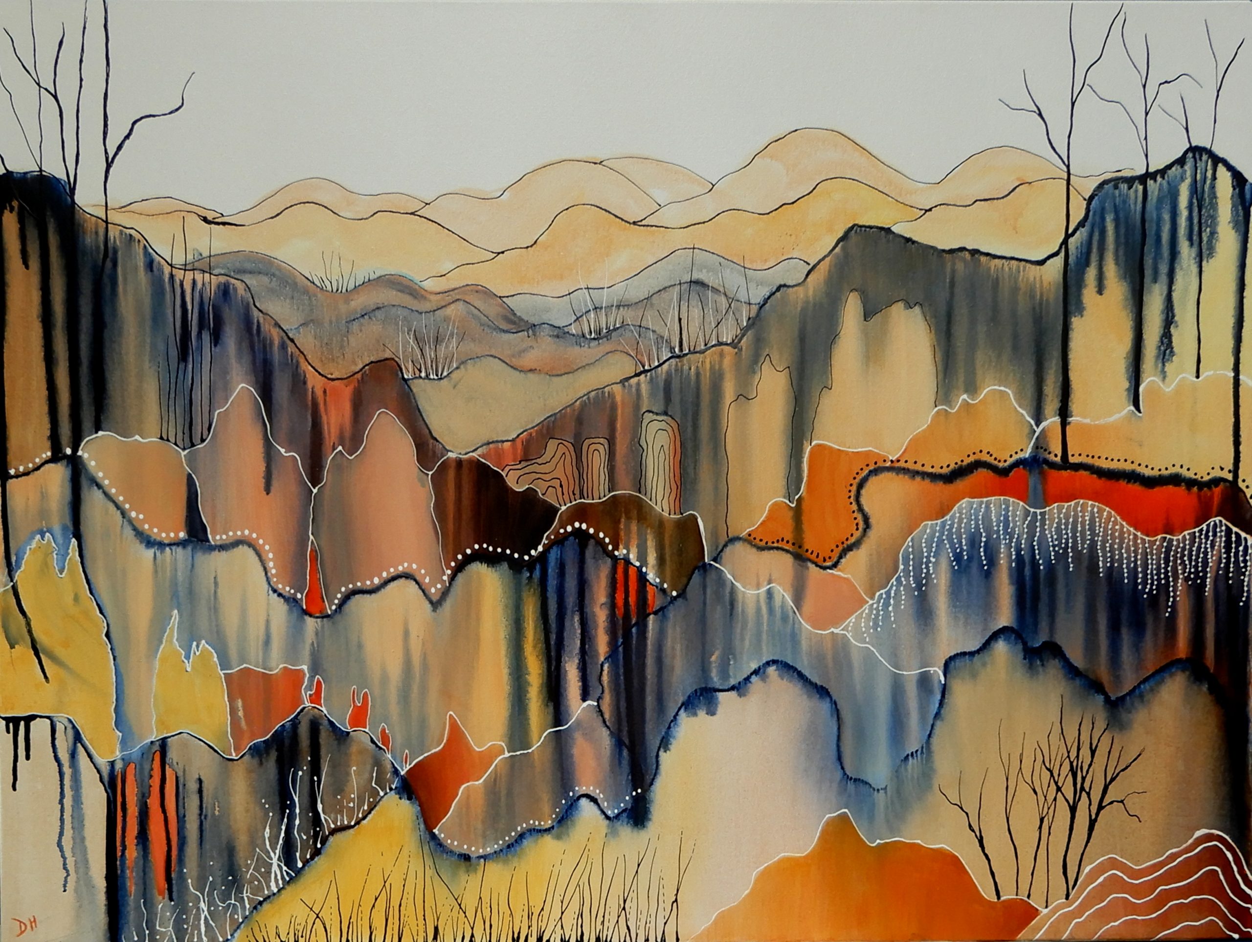 This Blue Mountains abstract painting explores my memories of the dramatic forms and vast vistas of this rugged and ancient mountain range. I used a more muted palette than usual, with varying shades of blue/grey.