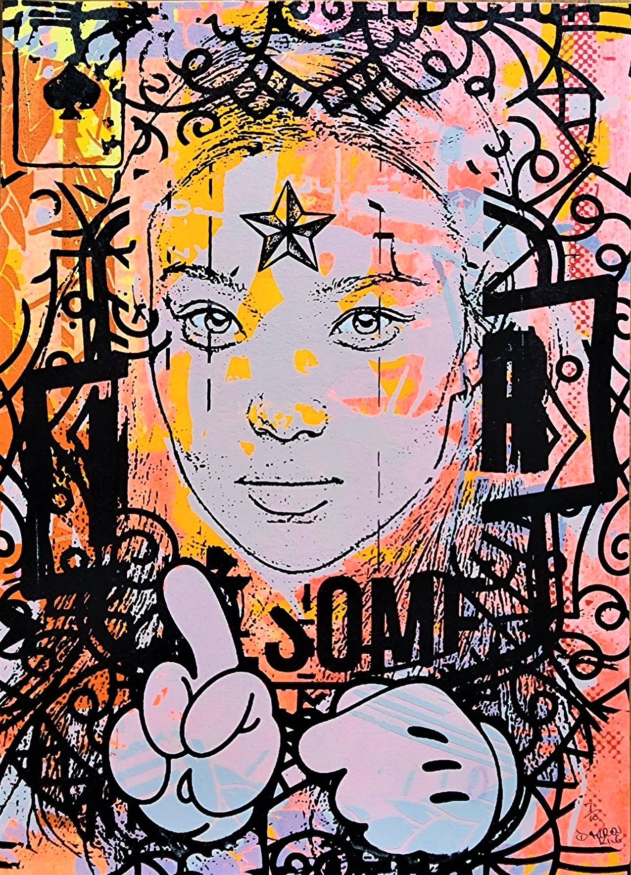 Each piece consists of a 4 colour gloss screen print & the rest is unique. Each background is hand painted in fluoro pink & yellow poster ink & each piece is hand finished with enamel paint. These pieces have strong vibrant colours. These are much stronger & brighter in person than the jpeg pics indicate.
